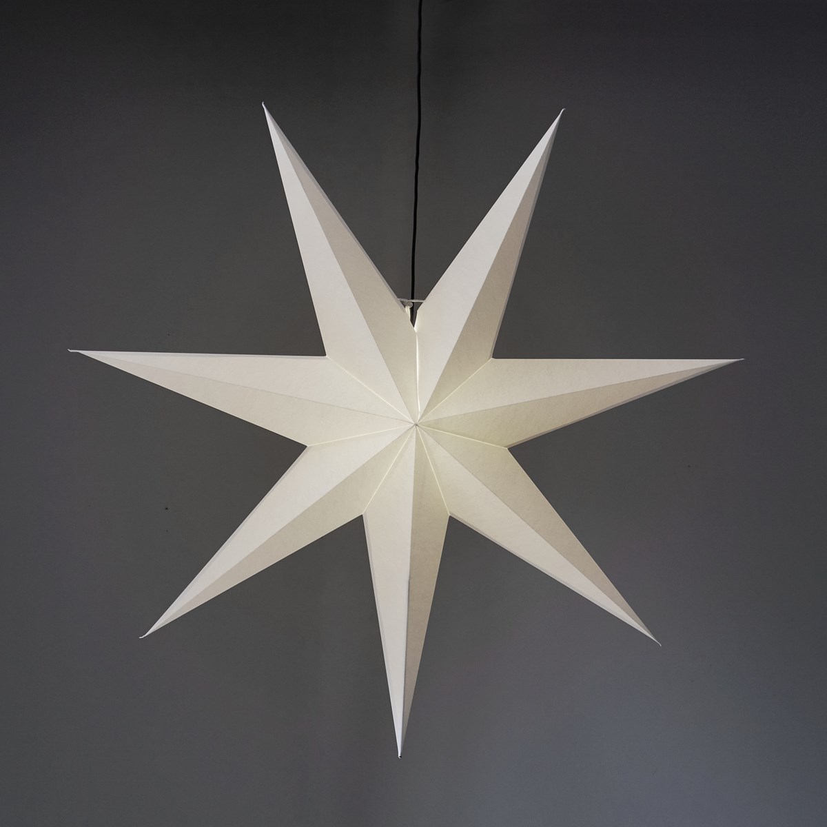 Vit pappersstjärna med 3,5 m svart textilkabel. Elegant stjärna att dekorera med i fönstret. Stjärnan har plats för en ljuskälla. Sockel E14. Mått: 100x100 cm.
