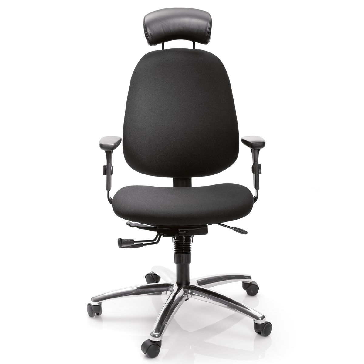 Komplett arbetsstol med arm- och nackstöd. Enkla och tydliga reglage. Gungfunktion med ställbart motstånd, ställbar rygg i vinkel och höjd och sits justerbar i djup. Armstöden går att justera i höjd, bredd och djup beroende på hur de monteras. Polerat fotkryss med hjul för hårda golv. Rygg: 49 x 55 cm. Sits b x d: 53 x 46 cm. Sitthöjd: 42–54 cm. Tyg: svart Event. Frakt tillkommer, kontakta oss för prisuppgift.