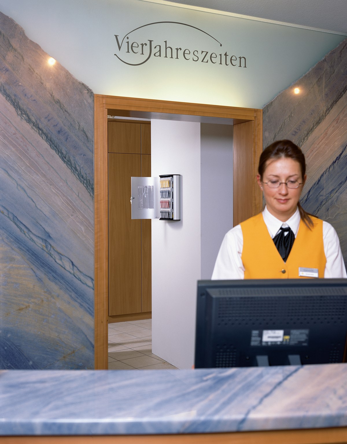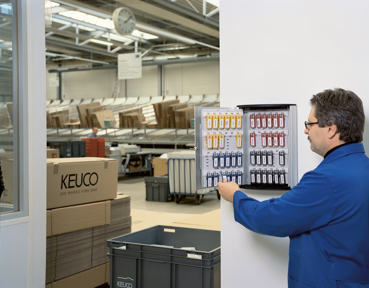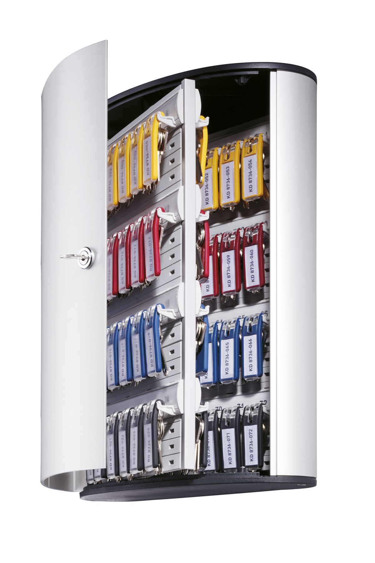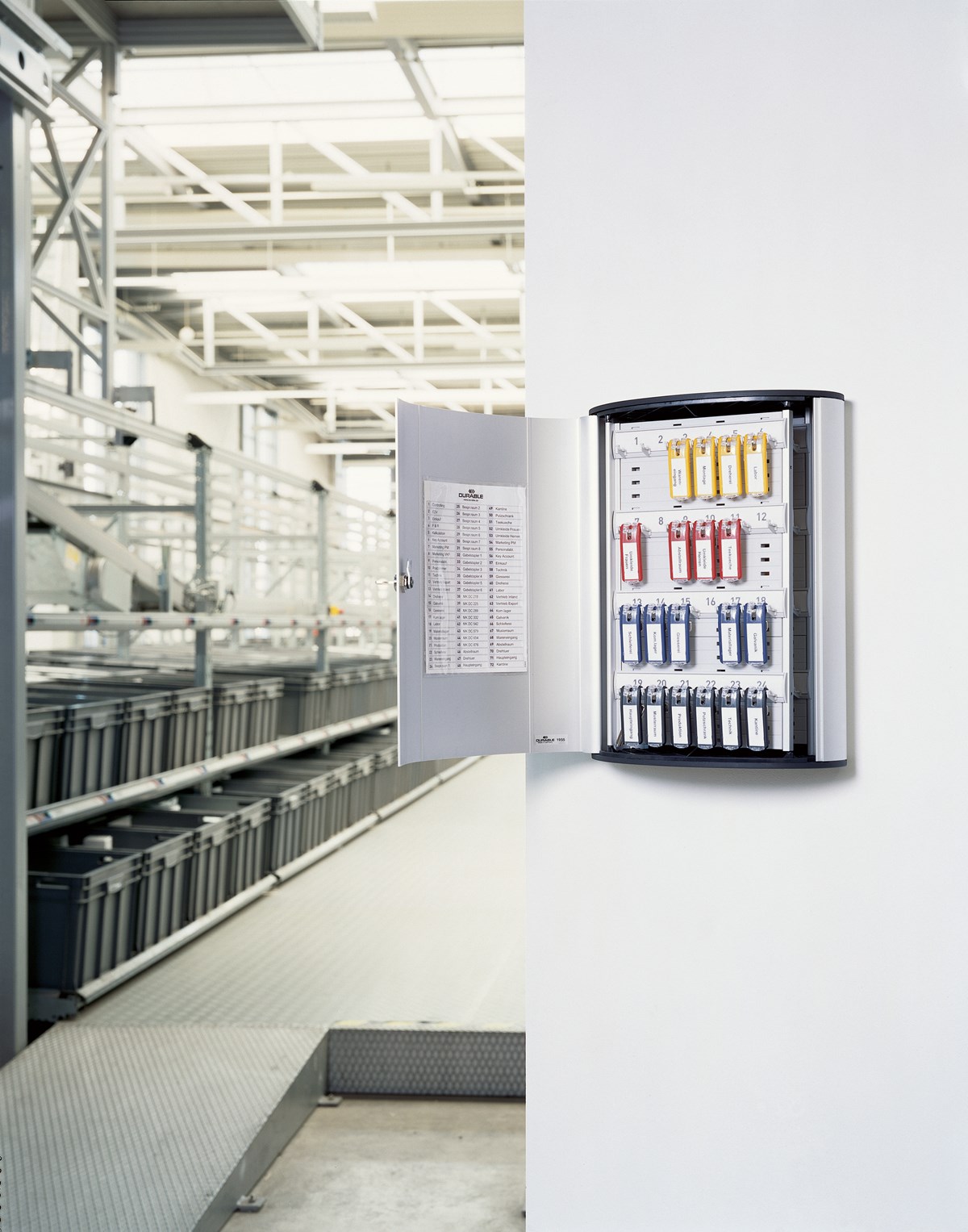 Skåp av aluminium. Cylinderlås med 2 nycklar. 6 st nyckelbrickor i blandade färger medföljer. Nyckeln hänger bakom brickan, vilket gör att etiketten alltid syns. Mallar för utskrift av etiketter till nyckelbrickor och nyckelförteckning kan laddas ner från www.durable.se.