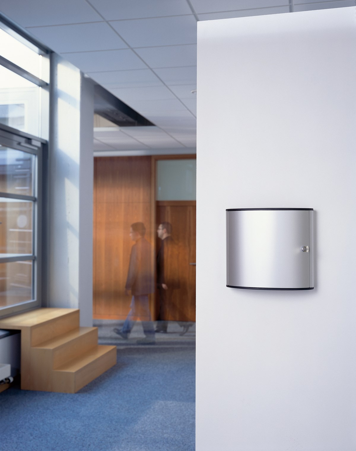 Skåp av aluminium. Cylinderlås med 2 nycklar. 6 st nyckelbrickor i blandade färger medföljer. Nyckeln hänger bakom brickan, vilket gör att etiketten alltid syns. Mallar för utskrift av etiketter till nyckelbrickor och nyckelförteckning kan laddas ner från www.durable.se.