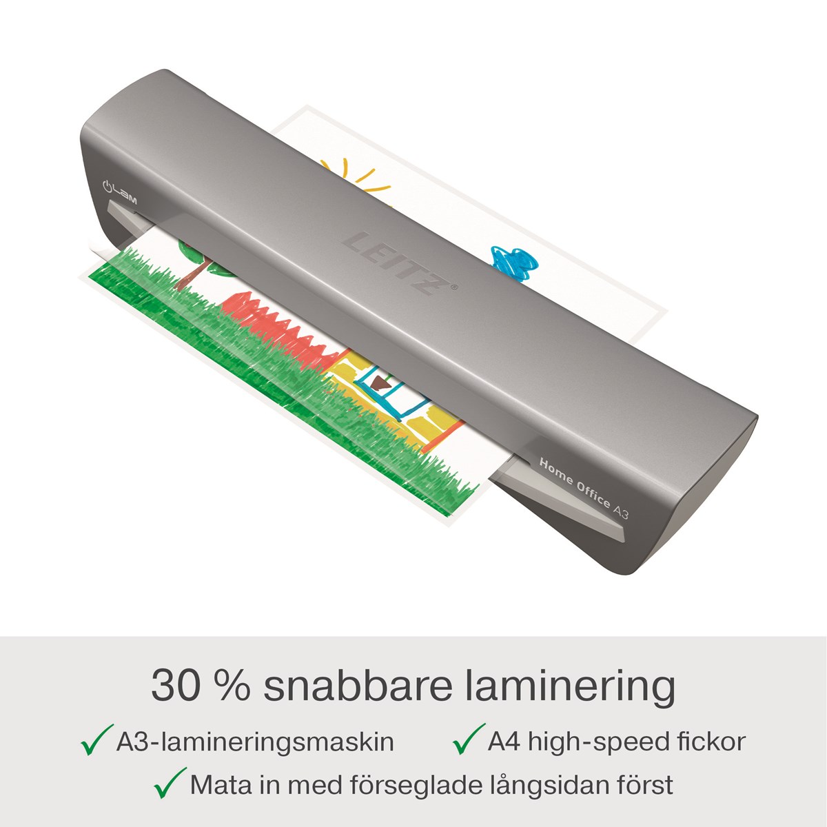Klar att använda på bara 2 minuter med en snabb uppvärmningstid Laminerar ett A4 med 80 mikrometer på cirka 45 sekunder och är även kompatibel med A4-höghastighetsfickor Kompatibel med fickor från 75 till 125 mikron. Minska energiförbrukningen med den automatiska standby-läget efter 15 minuter Innehåller ett startpaket med 5 x A4-fickor (80 mikron)