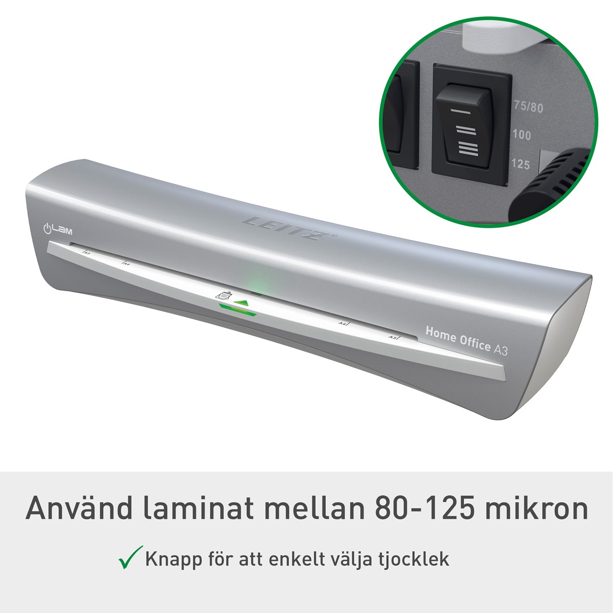 Den eleganta och kompakta lamineringsmaskinen Leitz iLAM Home Office kombinerar modern design med funktionalitet. Denna A3-laminator är utformad för bekvämlighet och har en snabb uppvärmningstid på 2 minuter och kan laminera ett 80-mikron A4-ark på bara 45 sekunder. Med ett enkelt knapptryck väljer du mellan tre olika ficktjocklekar för att passa olika behov, från vardagsdokument till viktiga papper som ska hålla länge. Den manuella anti-jam-frigöringsspaken säkerställer problemfri drift genom att snabbt lösa eventuella stopp. Den innovativa smarta status-LED:n gör användningen enklare med intuitiva ljus och ljud: rött under uppvärmning, grönt med en ljudsignal när den är redo och blinkande rött för standby-läge efter 15 minuters inaktivitet. Skydda dina dokument snabbt, effektivt och med stil.