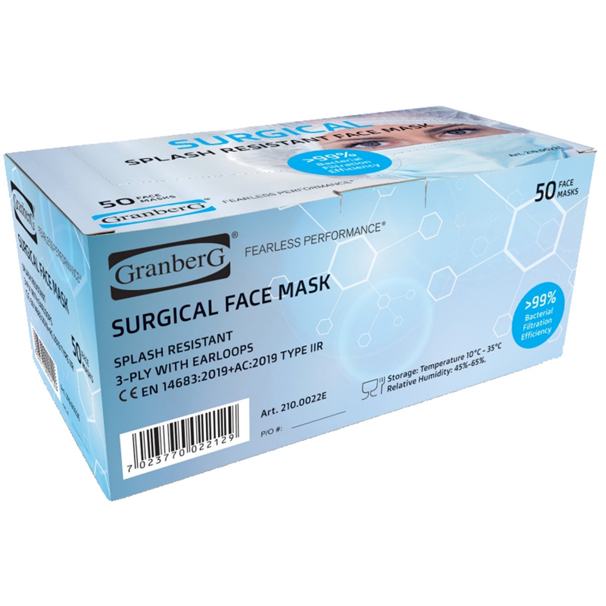 Medicinskt munskydd i nonwoven som skyddar mot stänk av blod och kroppsvätskor. Material i tre skikt med elastiskt band för öronen. > 99% partikelfiltrering. Latexfria. Uppfyller kraven för Europeiska standarden för medicinska munskydd EN 14683:2019+AC:2019. One size.