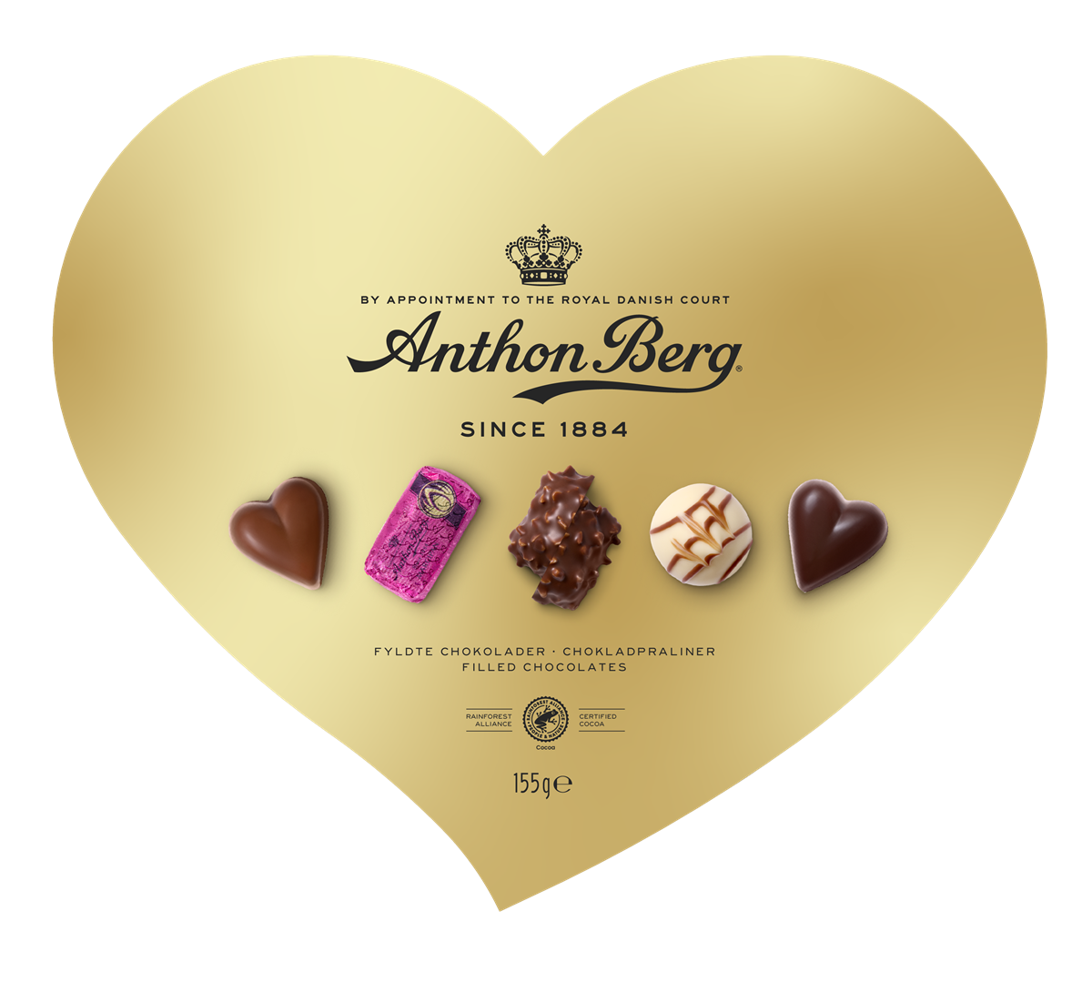 Hjärtformad Guldask 155 g från Anthon Berg med ett urval av våra fina chokladpraliner. Perfekt när du vill visa din uppskattning. Chokladen innehåller inte gluten.