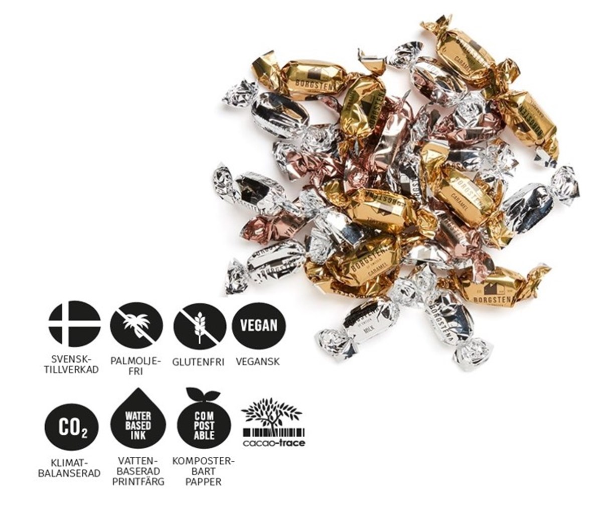 Cellofanpåse i återvunnen plast fylls med 250 g Cacao Trace-certifierad choklad från Borgstena. Glutenfri och svensktillverkad. Tryck din logga eller ditt budskap på produkten. Förpackningen har vattenbaserade färger och med FSC-certifierat papper.