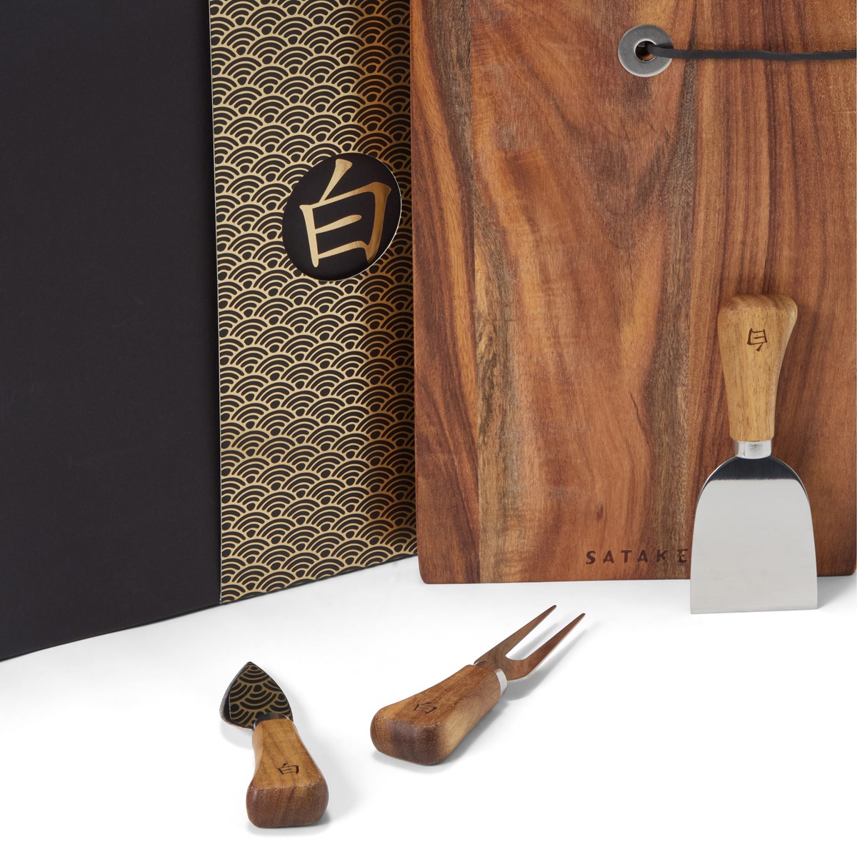 Satake Shiro ostset har en liten läcker skärbräda i akacia som är 17x25 cm med en mockarem för upphängning. Skärbrädan kommer i ett set med tre ost- & charkredskap. En kniv, en spatel och en gaffel i rostfritt stål med snyggt designade skaft av akaciaträ. Bladlängd 7 cm och skaftlängd 7 cm.