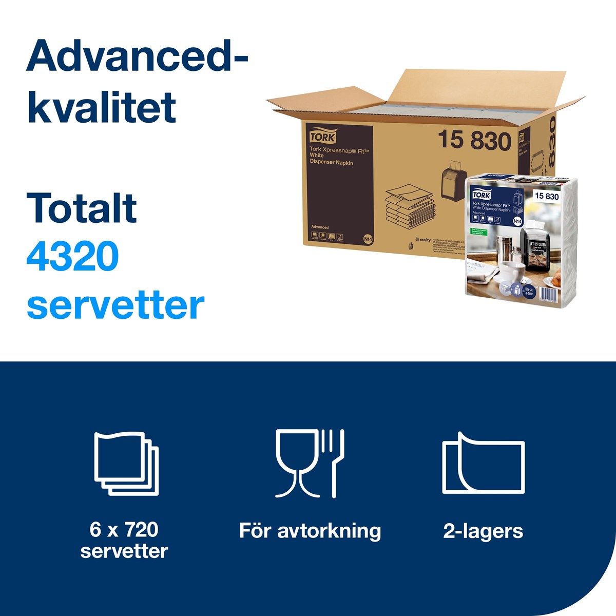 Fullstora servetter innovativt vikta för att spara plats. Vikta så att nästa ark automatiskt dras fram. Kvalitet Advanced. 2-lags. Format: 21,3 x 16,5 cm. 720 st/förp., 6 förp./kartong.
