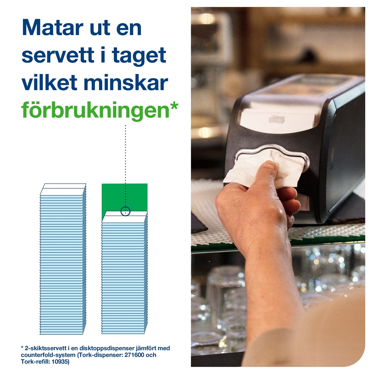 Servetterna matas ut en i taget och vecklas ut till full storlek Kompakt dispenser som tar liten plats på bordet och disken Nivåindikatorn visar när det är dags att fylla på dispensern