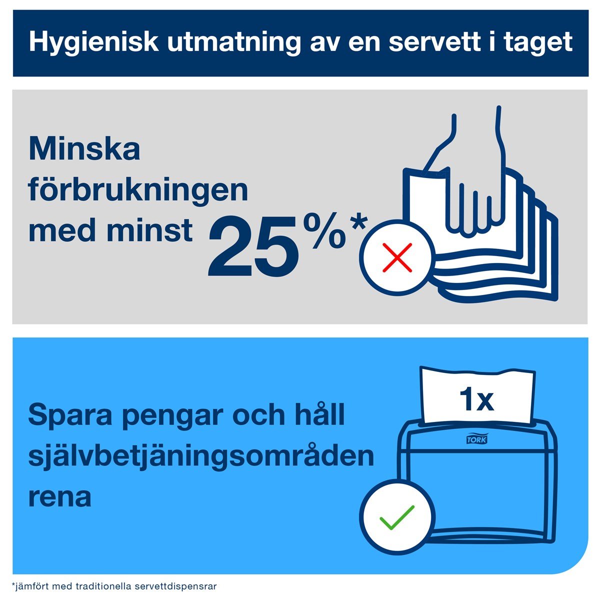 1-lagers servetter som är större som ovikta Unik förpackning som skyddar servettbuntarna vid förvaring och hantering Kontrollera förbrukning och kostnader med utmatning av en servett i taget Kan användas med Tork N4 Xpressnap dispensrar för servetter