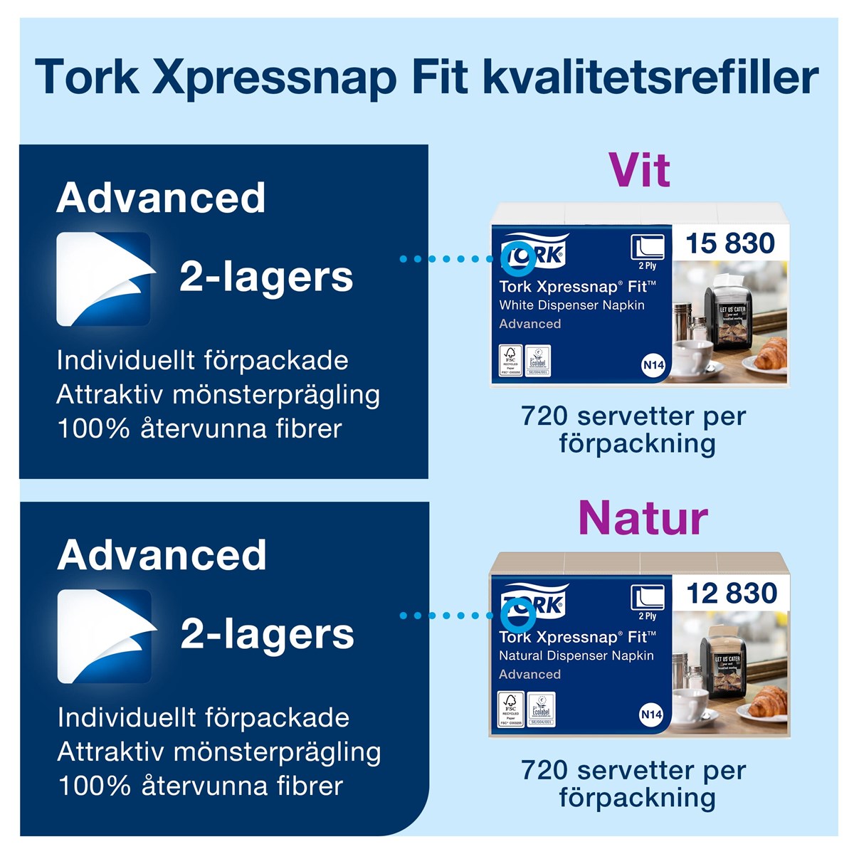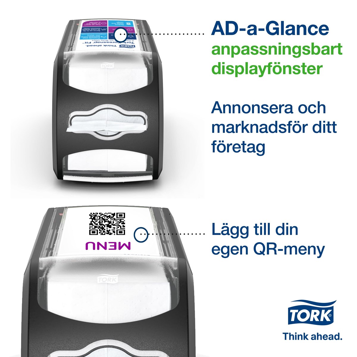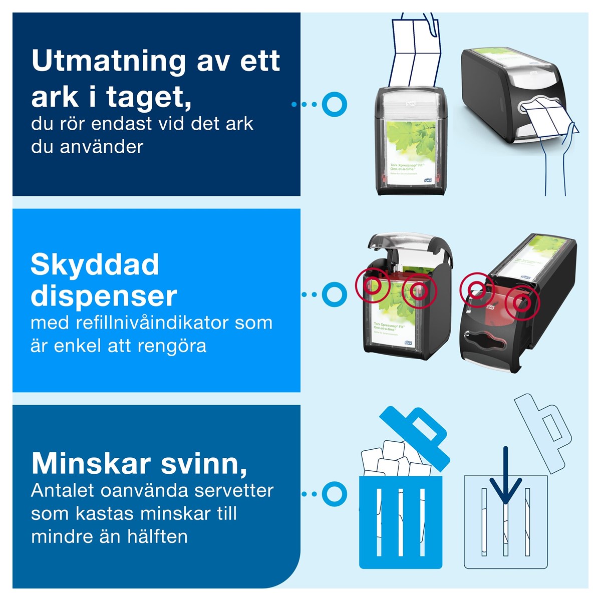 Kompakt, liggande dispenser som matar ut en servett i taget vilket minskar förbrukningen och avfallet. Utmärkt för diskar. Placera eget budskap i reklamrutan. Enkel påfyllning och refillindikator som visar när det är dags att fylla på nya servetter. Rymmer 324 st N14- servetter. Format: L32,6 x B12,1 x H14,3 cm.