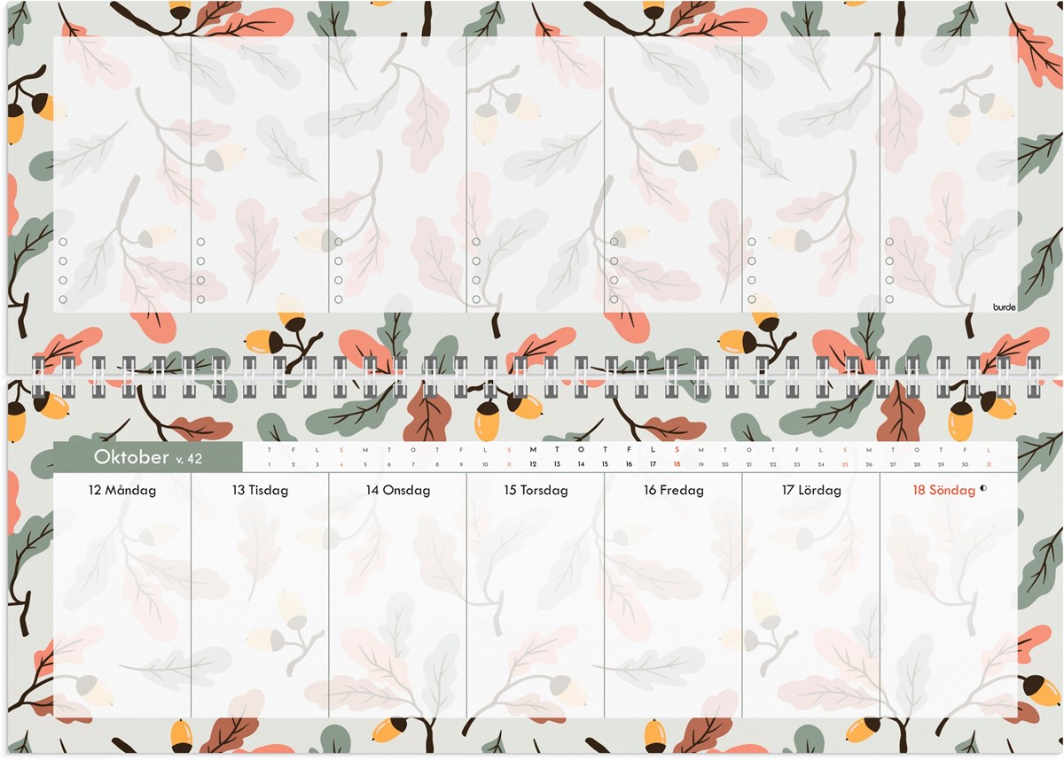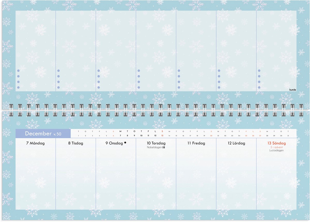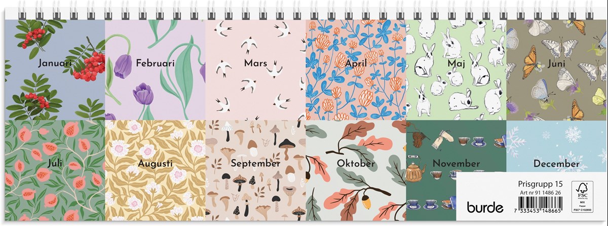 Format: 297x105 mm. Layout: Stående. Vecka/uppslag. Kalendarium: 2025-12-15 - 2027-01-03. Omslag: Kartong. Spiralbunden. Innehåll: Flaggdagar, Helgdagar/aftnar, Månfaser, Namnsdagar, Anteckningssidor, Temadagar/händelser, Årsplan/årsplaner. Antal sidor: 112. Miljöinformation: FSC®.