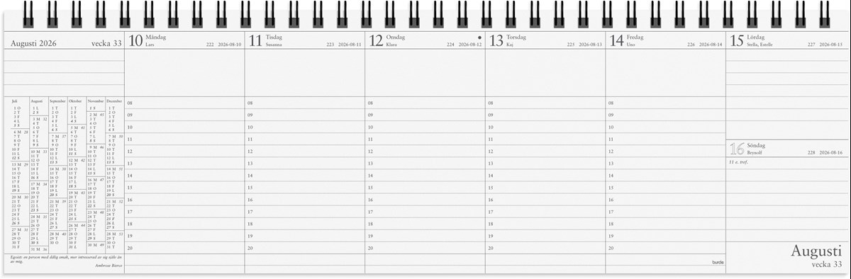 Format: 528x165 mm. Layout: Stående. Vecka/uppslag. Timindelning 8-20. Kalendarium: 2025-12-22 - 2027-01-03. Omslag: Kartong. Spiralbunden. Innehåll: Kyrkliga helgdagar, Flaggdagar, Helgdagar/aftnar, Månfaser, Namnsdagar, Temadagar/händelser, Årsöversikt/årsöversikter, Årsplan/årsplaner. Antal sidor: 56. Miljöinformation: FSC®.