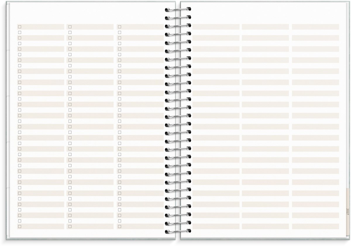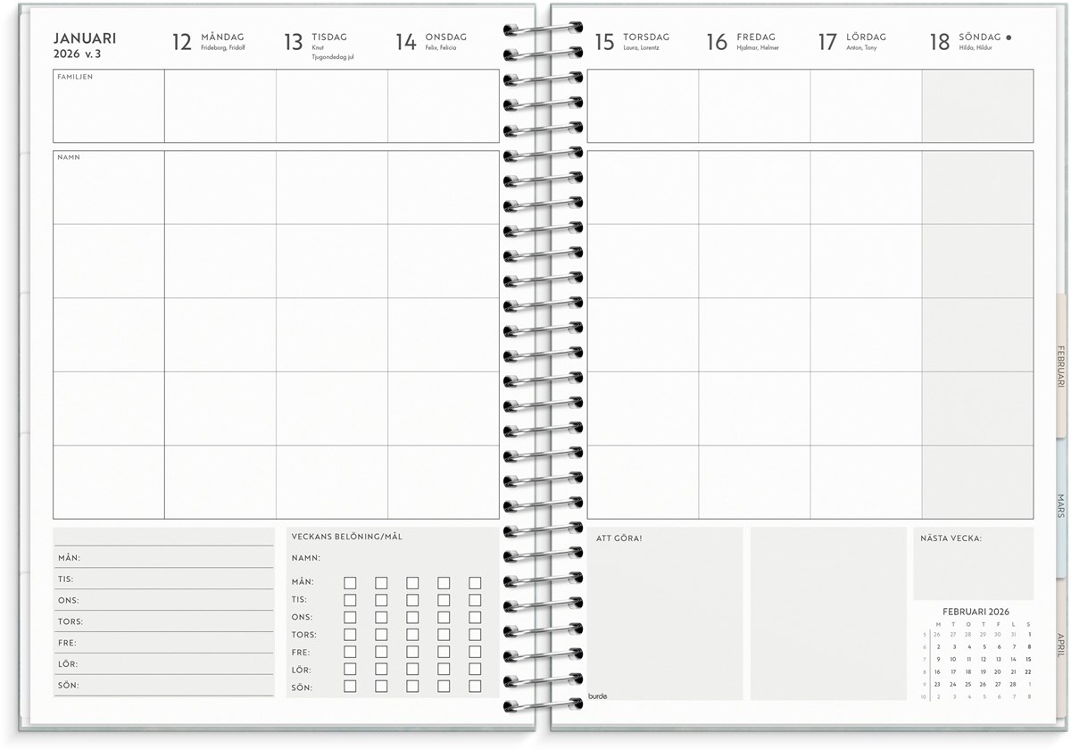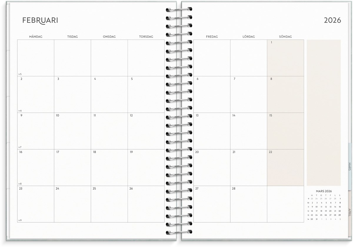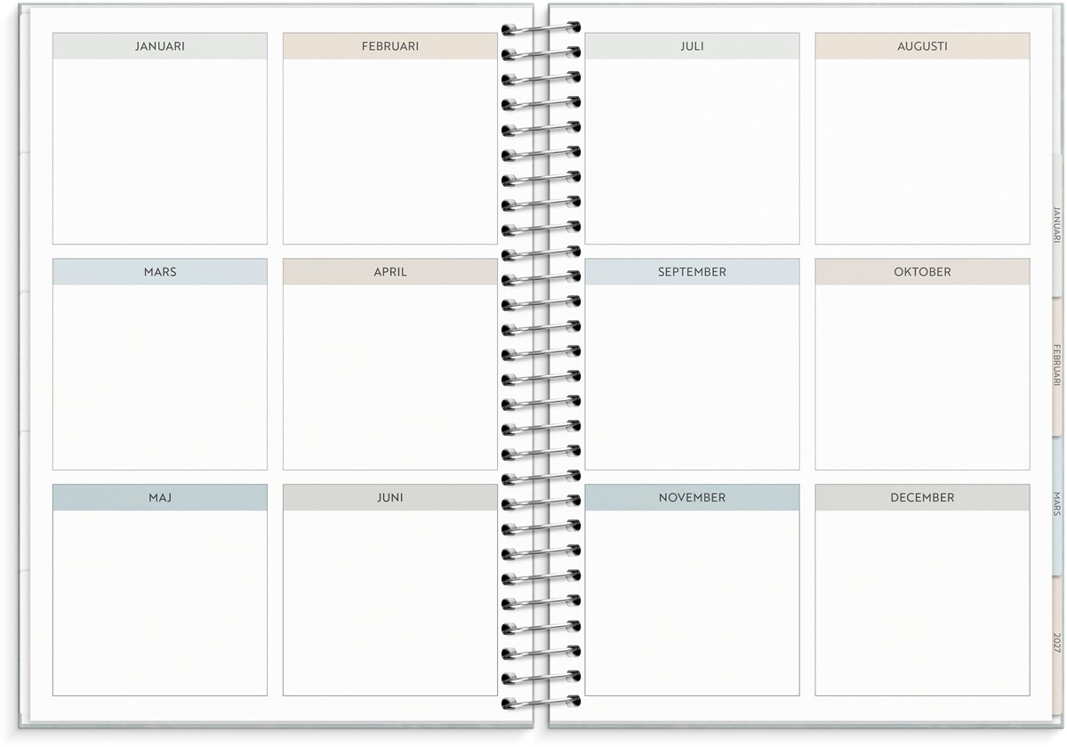Format: C5. Layout: Stående. Vecka/uppslag. Kalendarium: 2025-12-29 - 2027-01-03. Omslag: Kartong med struktur. Spiralbunden. Detaljer: Pappersficka. Innehåll: Flaggdagar, Helgdagar/aftnar, Månfaser, Namnsdagar, Anteckningssidor, Stickersark, Temadagar/händelser, Årsöversikt/årsöversikter, Årsplan/årsplaner. Antal sidor: 176. Miljöinformation: FSC®.