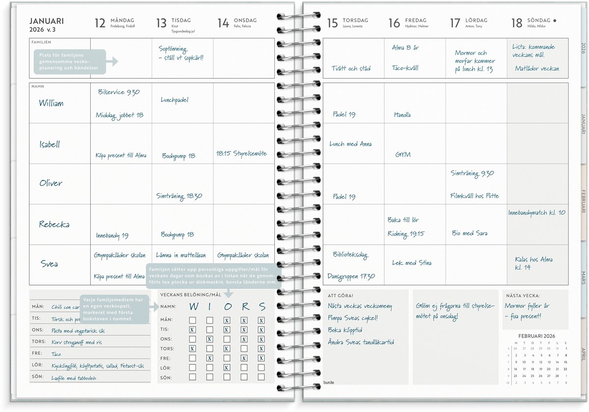 All planering för familjen i en och samma kalender! Belöningsmodul för att notera framstegen mot veckomål. Plats för veckans matsedel. I slutet av kalendern finns kom ihåg-, check- och att göra-listor m.m. Stickersarken gör planeringen ännu roligare!