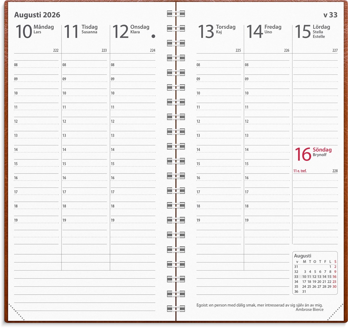 Format: 83x158 mm. Layout: Stående. Vecka/uppslag. Timindelning 8-19. Kalendarium: 2025-12-22 - 2027-01-03. Omslag: Konstläder. Spiralbunden. Innehåll: Atlas, Anteckningshäfte, Årsöversikt/årsöversikter, Årsplan/årsplaner. Antal sidor: 128. Miljöinformation: FSC® papper.