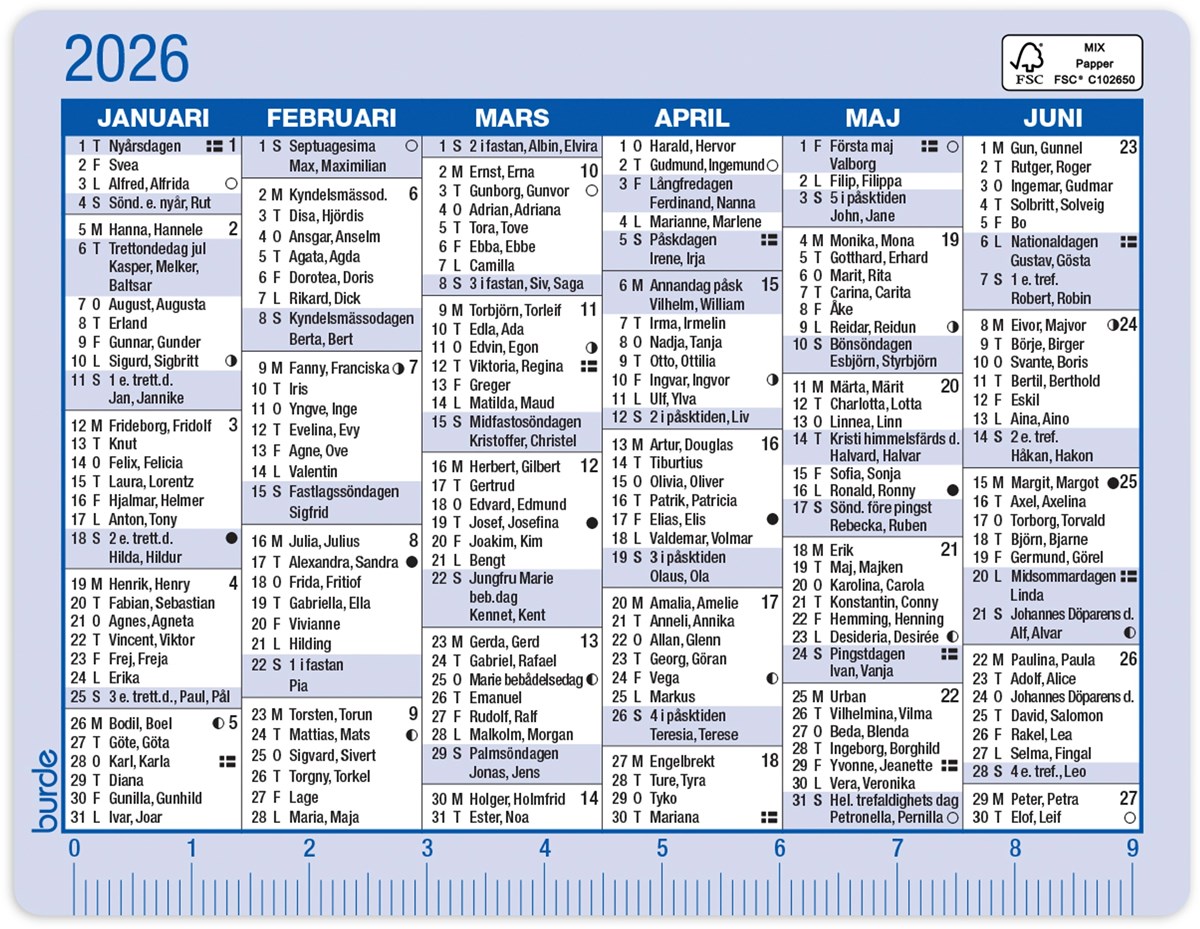Format: 100x77 mm. Layout: År/blad. Kalendarium: 2026-01-01 - 2026-12-31. Innehåll: Kyrkliga helgdagar, Flaggdagar, Helgdagar, Månfaser, Namnsdagar, Årsöversikt. Antal sidor: 2. Miljöinformation: FSC®.