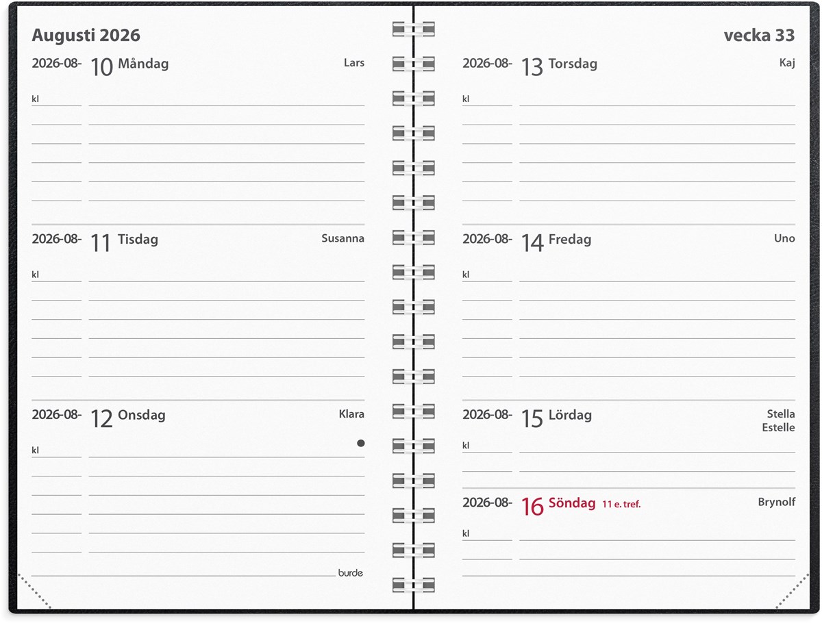 Format: 83x127 mm. Layout: Liggande. Vecka/uppslag. Kalendarium: 2025-12-15 - 2027-01-03. Omslag: Konstläder. Spiralbunden. Innehåll: Atlas, Kyrkliga helgdagar, Flaggdagar, Helgdagar/aftnar, Månfaser, Namnsdagar, Internationella helgdagar översikt, Telefonregister, Temadagar/händelser, Årsöversikt/årsöversikter, Årsplan/årsplaner. Antal sidor: 152. Miljöinformation: FSC®.