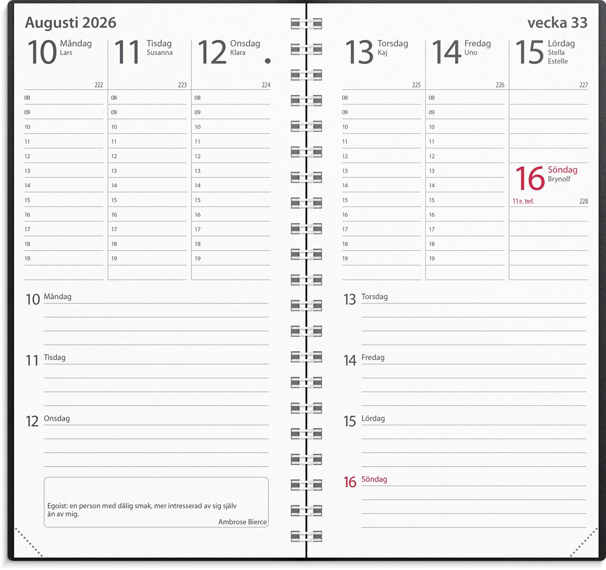 Format: 83x158 mm. Layout: Vecka/uppslag. Timindelning 8-19. Kalendarium: 2025-12-15 - 2027-01-03. Omslag: Plast. Spiralbunden. Innehåll: Kyrkliga helgdagar, Flaggdagar, Helgdagar/aftnar, Månfaser, Namnsdagar, Internationella helgdagar översikt, Telefonregister, Temadagar/händelser, Årsöversikt/årsöversikter, Årsplan/årsplaner. Antal sidor: 128. Miljöinformation: FSC®.
