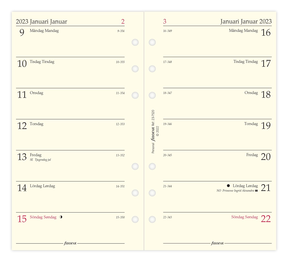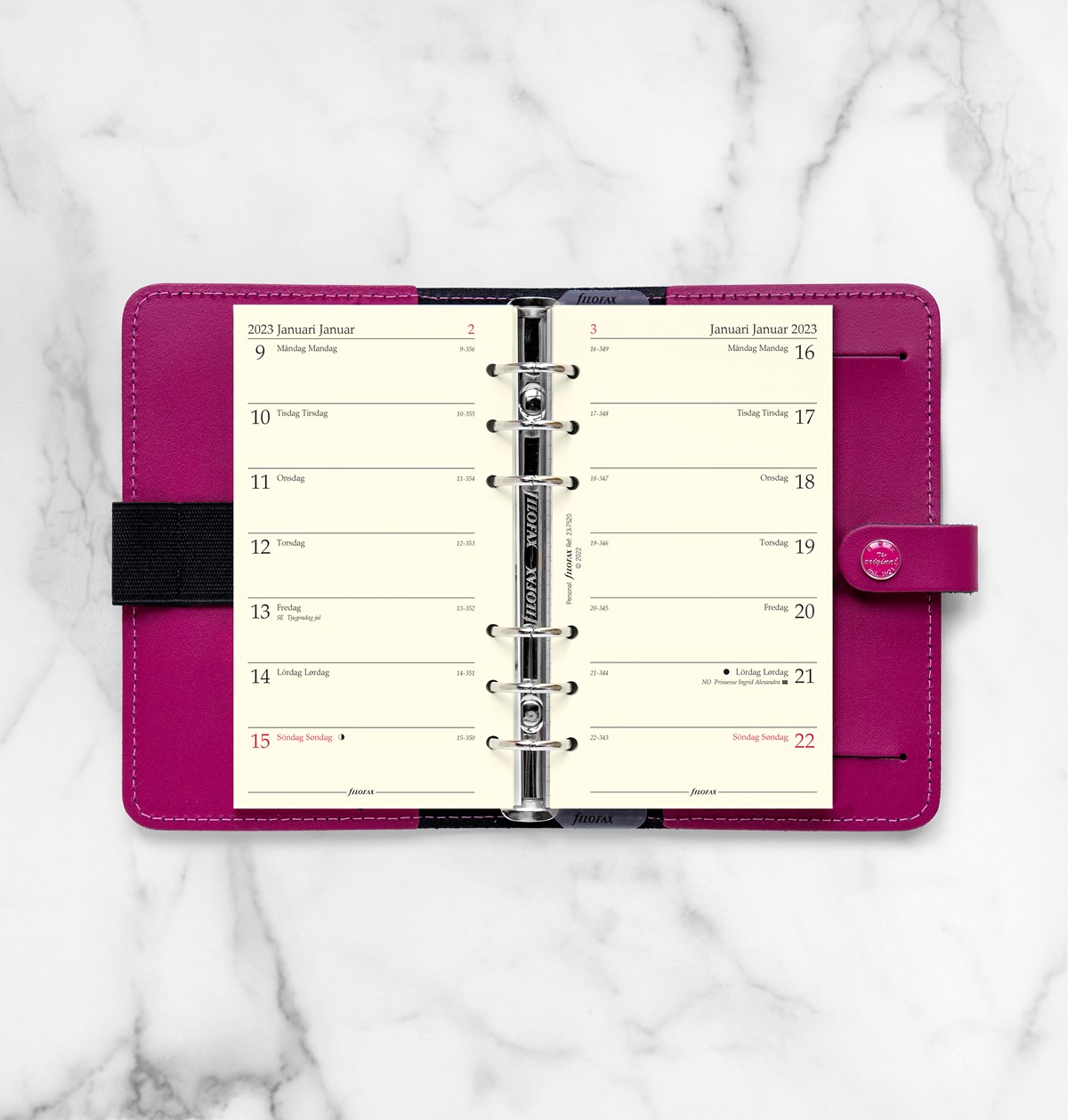 Filofax Dagbok Personal kalender för veckoplanering med en vecka/sida. 90 g cremefärgat papper. Språk svenska/danska/norska.