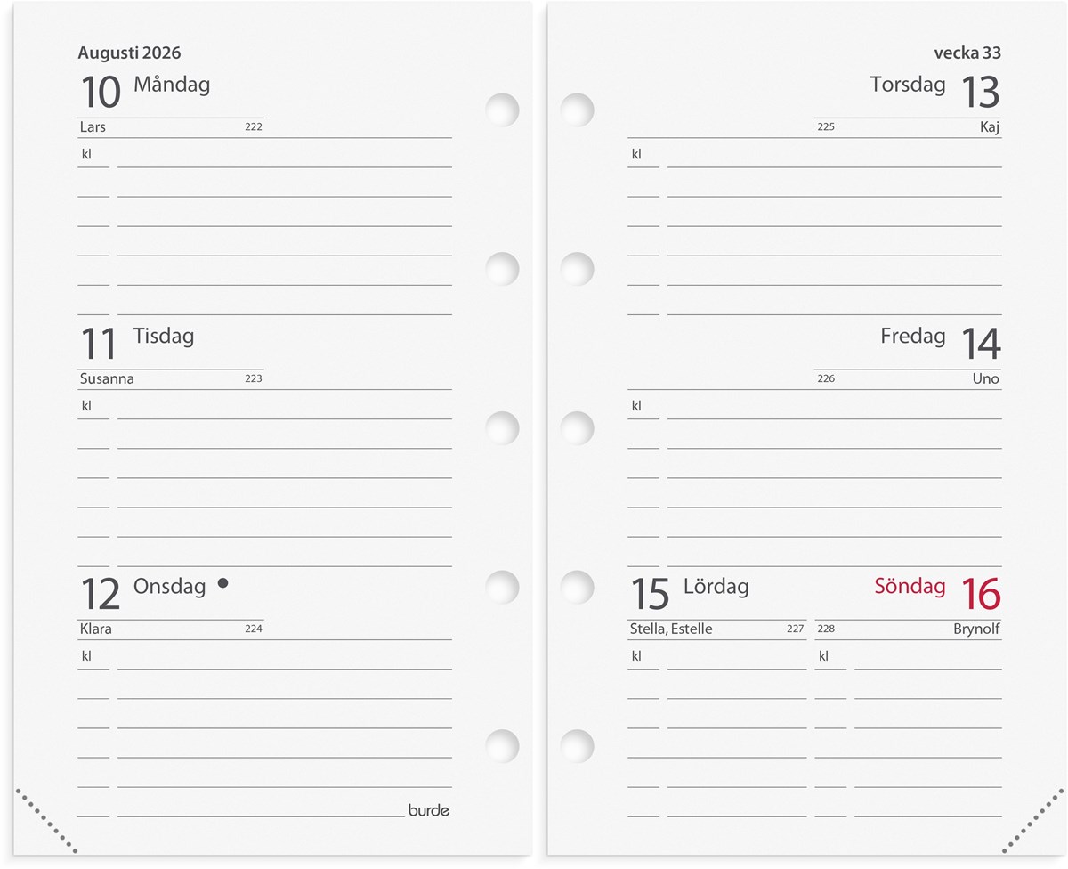 Format: 63x107 mm. Layout: Liggande. Vecka/uppslag. Kalendarium: 2025-11-10 - 2027-01-03. Omslag: Skinn. Innehåll: Flaggdagar, Helgdagar/aftnar, Månfaser, Namnsdagar, Temadagar/händelser, Årsöversikt/årsöversikter, Årsplan/årsplaner. Antal sidor: 160. Miljöinformation: FSC® papper.
