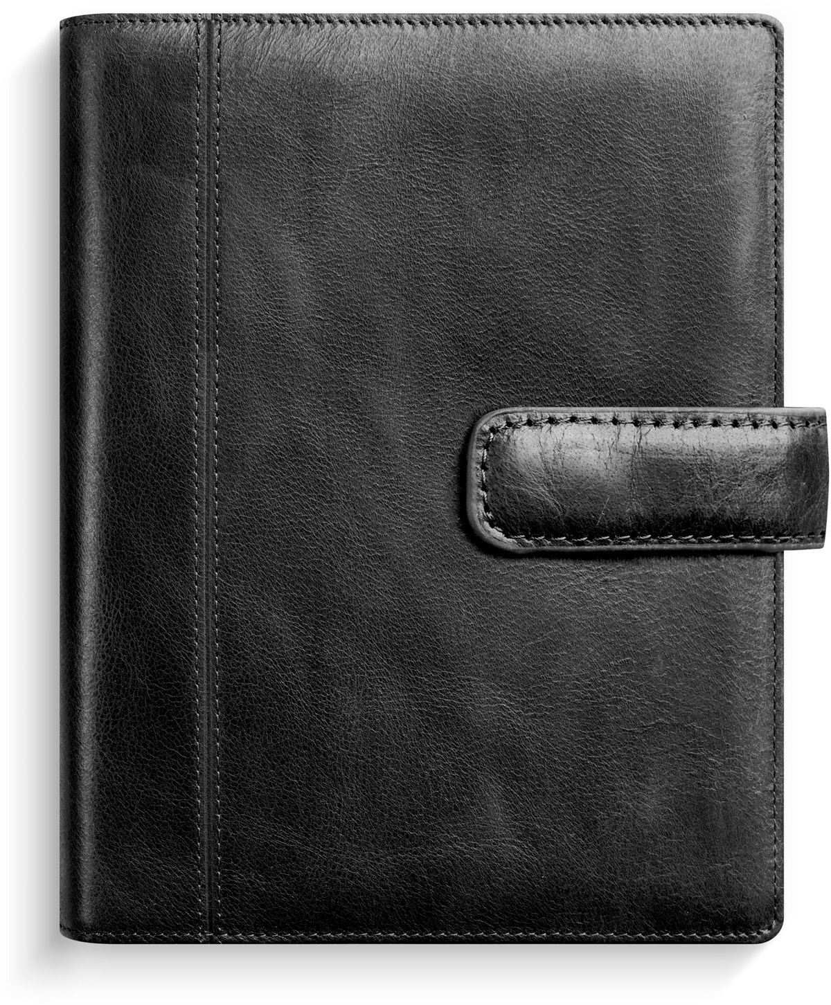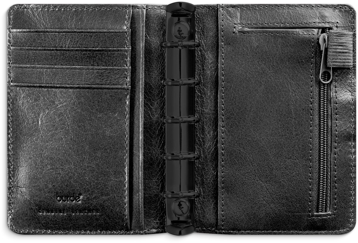 Systemkalender med grundsats. Grundsatsen innehåller hålad kalenderdel (4101) med telefonregister och register A-Ö. Pärmen har ringmekanism (Ø 15 mm), fyra kreditkortsfickor, sedelfack, myntficka och pennhållare. Format pärm: 90x120 mm.