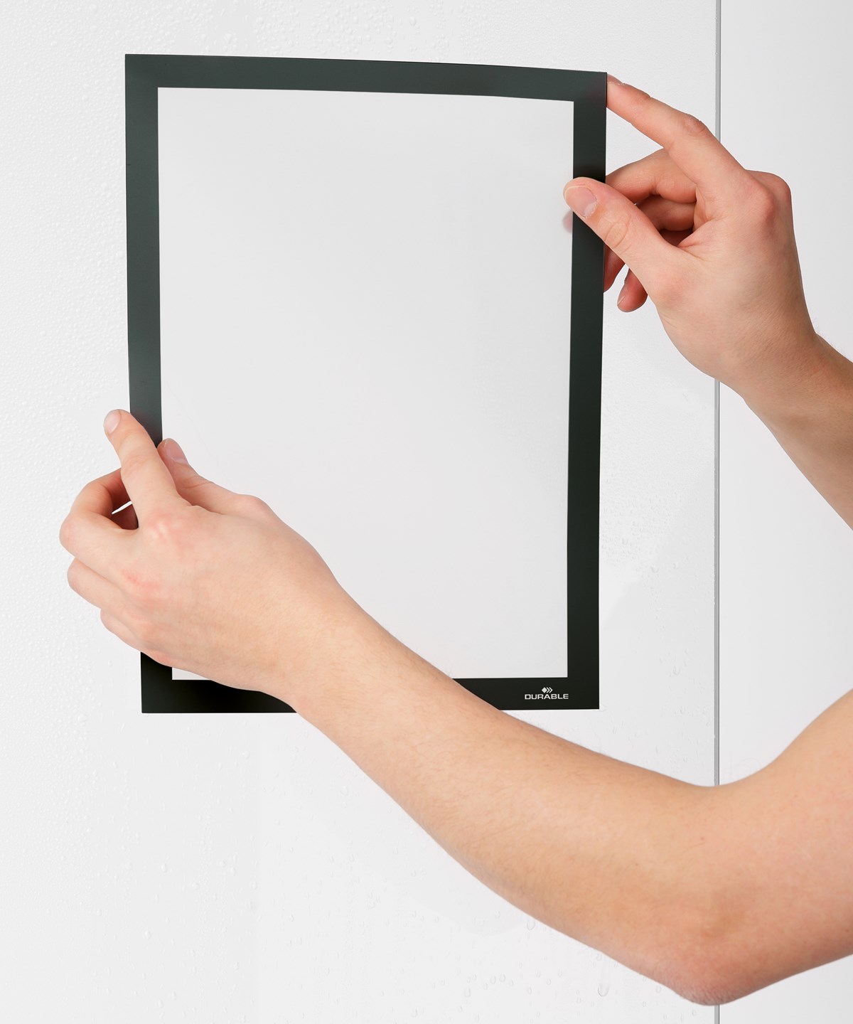Fäster statiskt, för glasytor som exponeras för solljus. Lätt och bubbelfri montering. Kan tas bort och åter sättas upp. Värmetålig upp till 70 °C. UV-stabil upp till 2 år. Innehållet kan snabbt sättas in och bytas ut tack vare den öppningsbara magnetramen. För stående och liggande format. 2 st/förp.