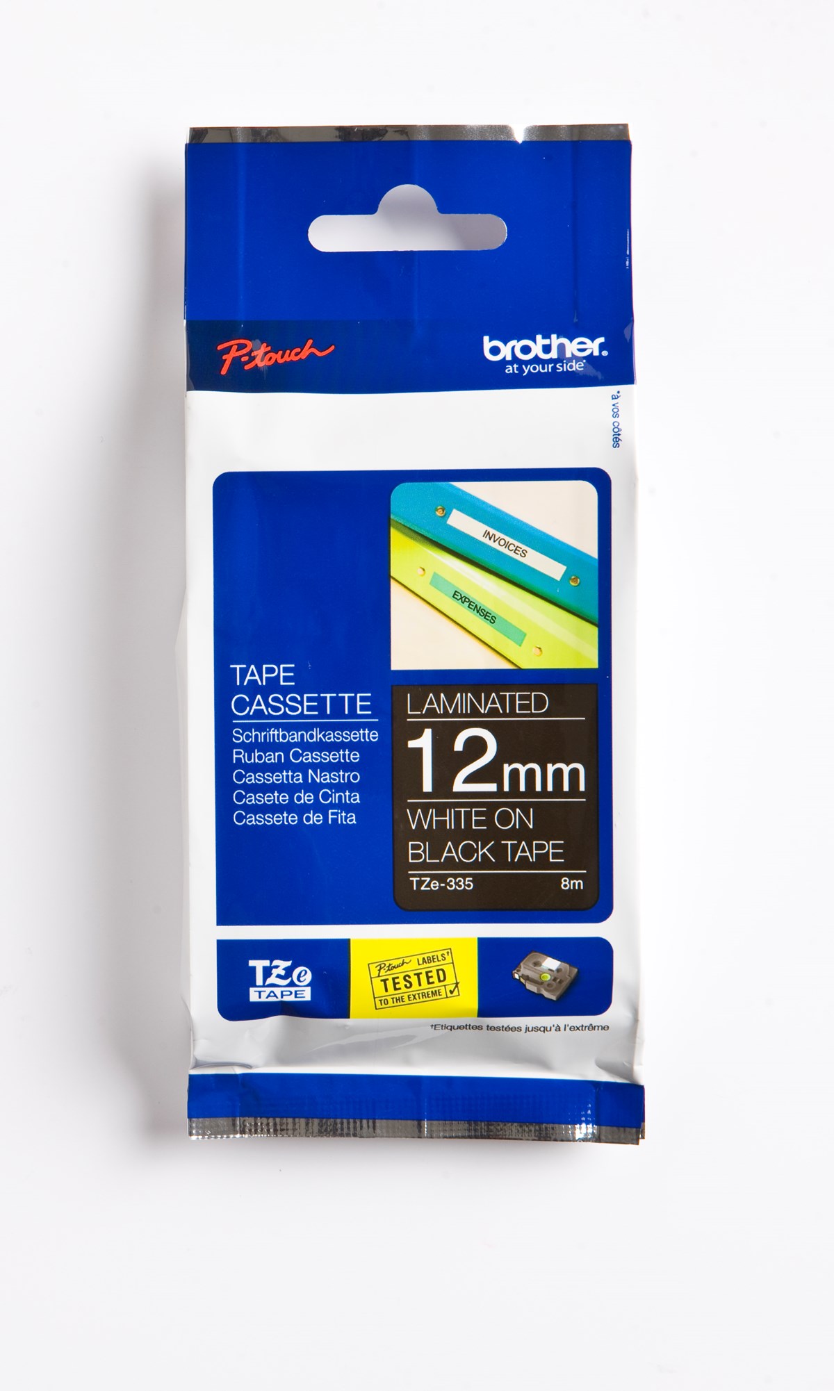 TZe tapekassetter är enkla att installera, finns i olika bredder, färger och material och säkerställer att din P-touch-märkmaskin uppfyller dina märkningsbehov. Mått: 12 mm x 8 m.