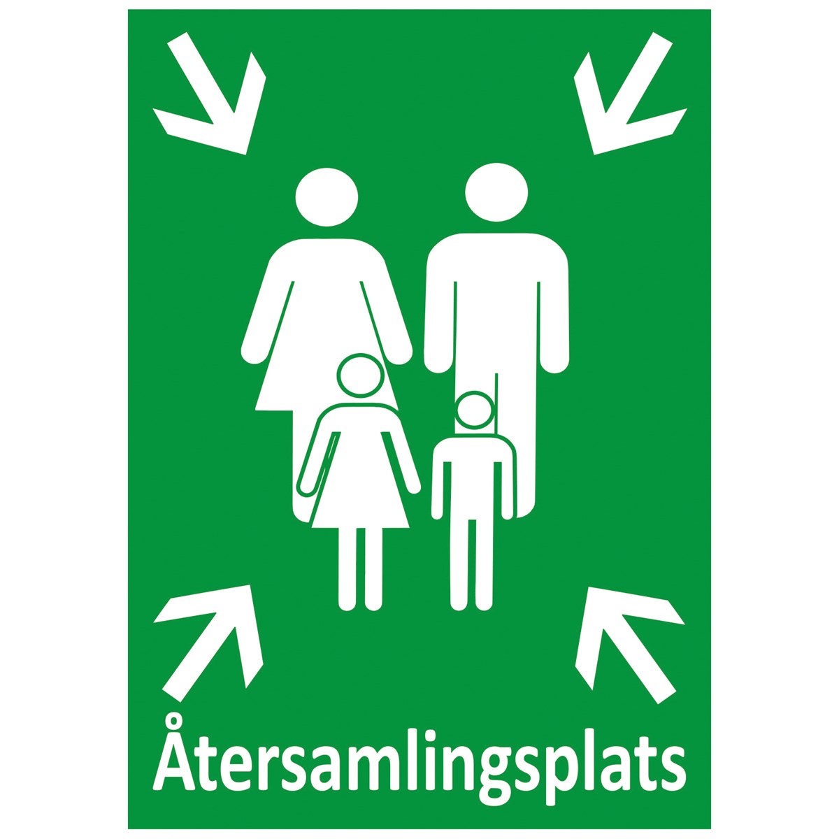 Utrymningsskylt med symbol för återsamlingsplats. Bidrar till ökad säkerhet och gör det lättare att orientera sig i händelse av brand eller annan fara. Tillverkad i aluminium. Mått: 297 x 420 mm.