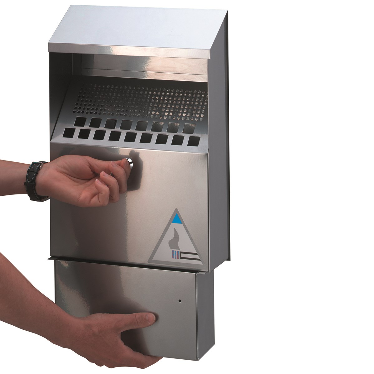 Praktisk askkopp av metall för väggmontering utomhus (bör monteras under tak). Låsbar tömningslucka med innerbehållare, lätt att tömma. Kapacitet: 4 liter. Mått: 31 x 45 x 11 cm. Grå.