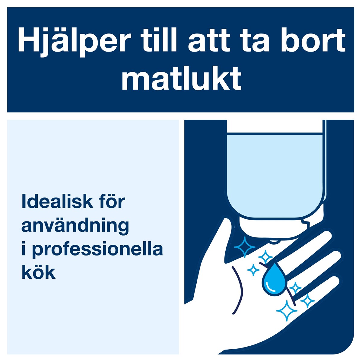 Tar bort vanligt förekommande matlukter från händerna Inga tillsatta doft- eller färgämnen, mild mot huden Dermatologiskt testad Lämplig för användning i alla miljöer där livsmedel hanteras