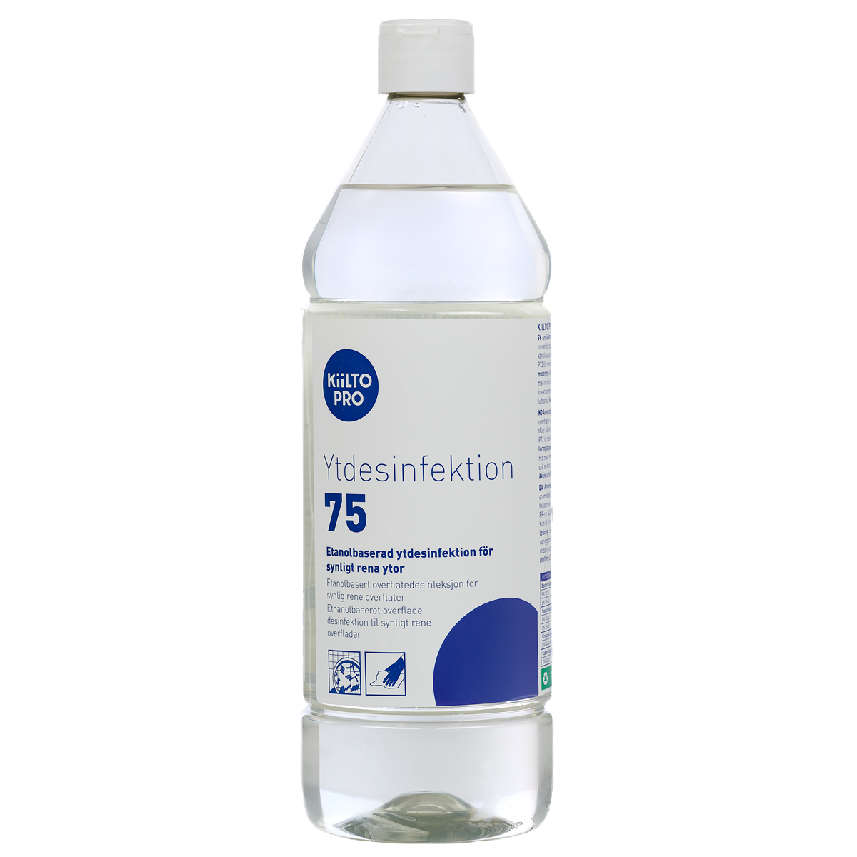 Kiilto Pro Ytdesinfektion 75 är en färdig brukslösning avsedd för desinfektion av synligt rena, släta ytor och är effektiv mot bakterier, svamp och olika typer av virus som t.ex Corona, HIV, Hepatit B och C samt vissa nakna virus som Adenovirus och Murine Norovirus. Den verkar snabbt och effektivt utan att lämna spår på den behandlade ytan.