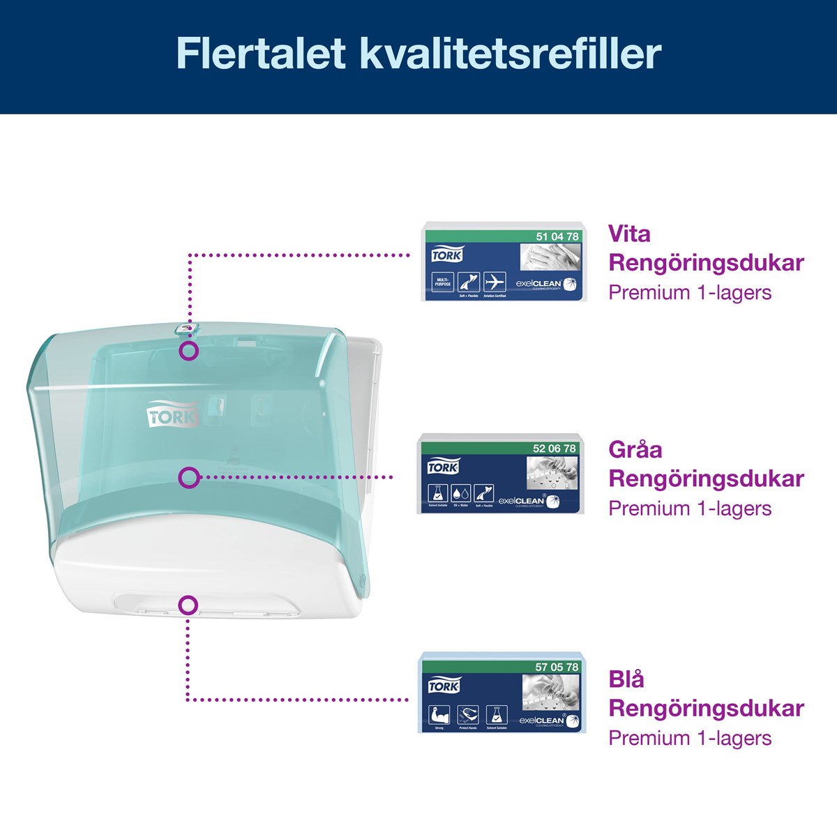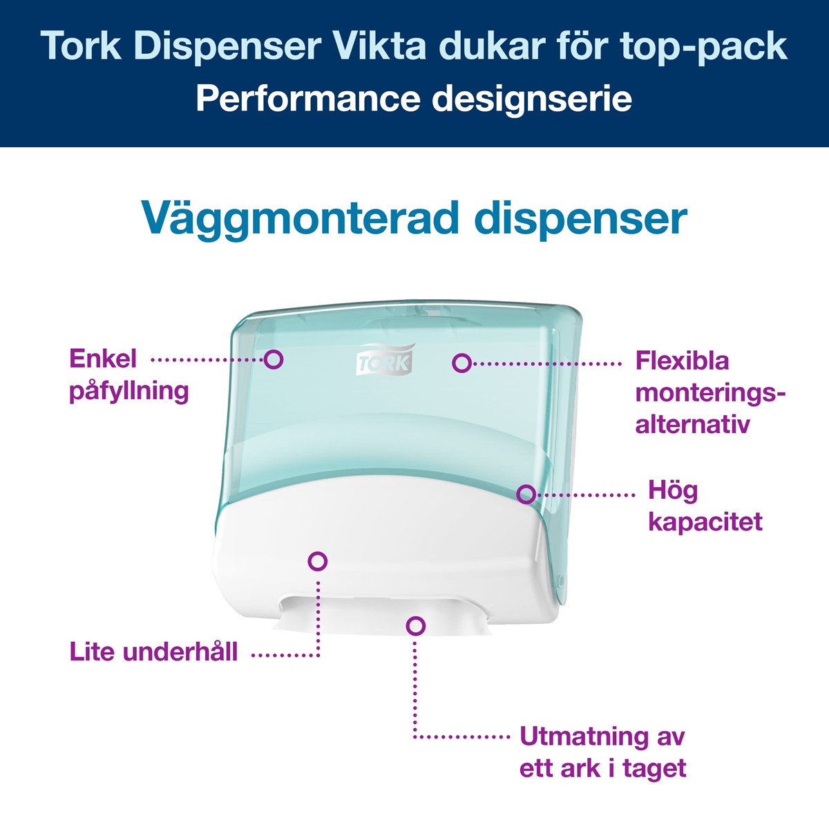 Väggmonterad för att spara plats Enkel påfyllning ger mindre underhåll Utmatning av en duk i taget minskar förbrukning och avfall