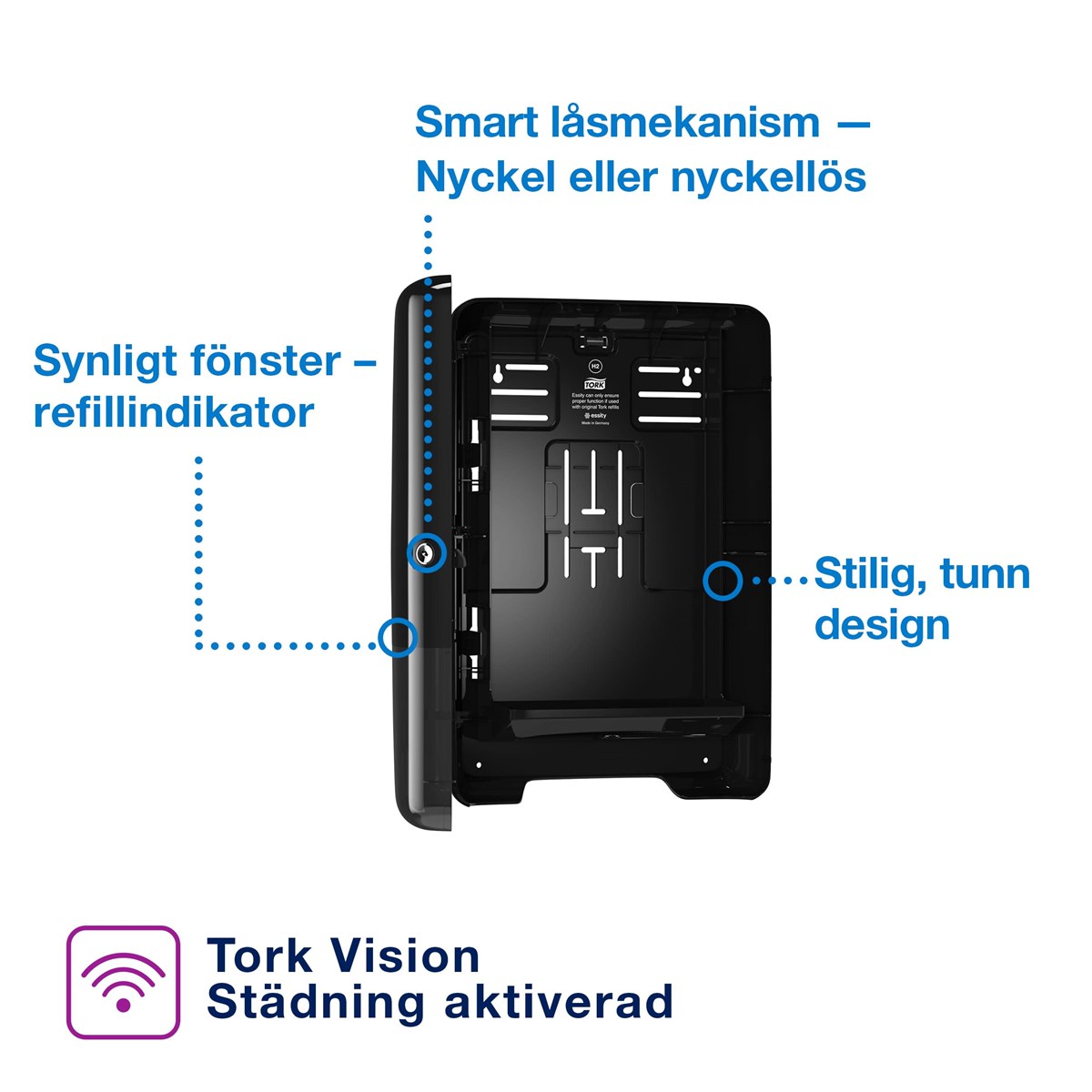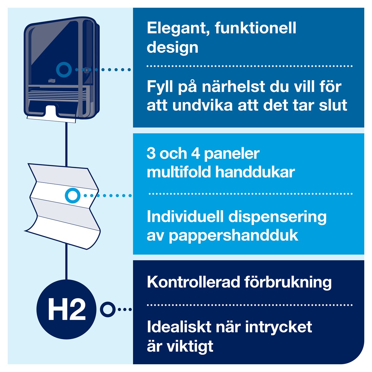 Hygienisk utmatning av en handduk i taget Enkel påfyllning, enkelt underhåll För toalettutrymmen med låg och medelhög besöksfrekvens Förborrat borrhål för enkel väggmontering Håller max 2,5 buntar