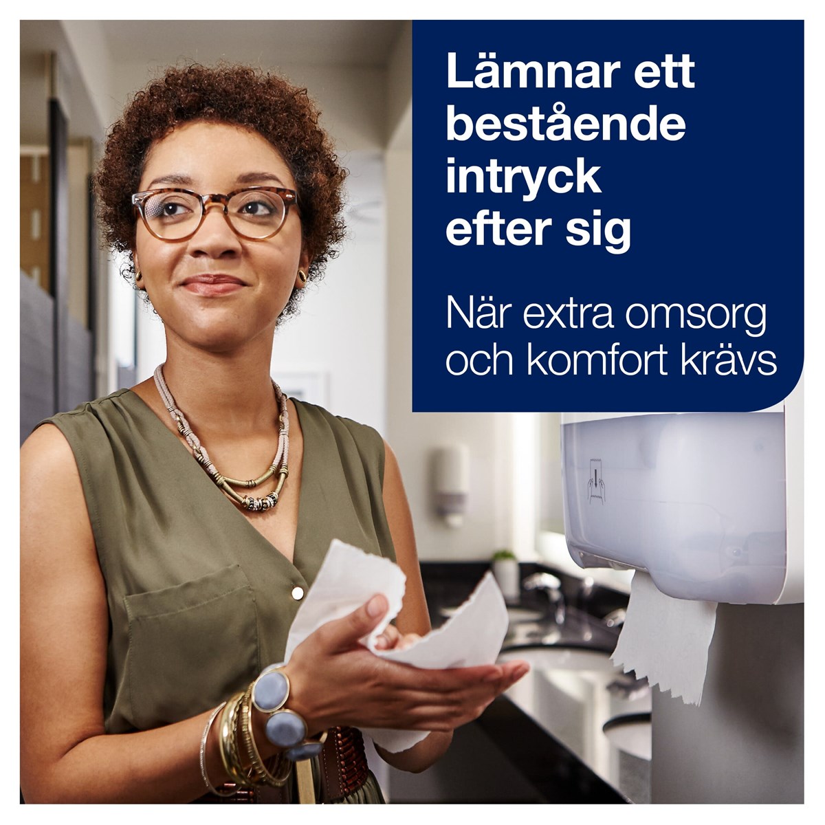 Extra mjuka hand dukar av högsta kvalitet (Premium). 2-lags vita artk med blå dekorprägling. Passar till handdukshållare Tork Matic H1. 100 m, 404 ark/rulle, 21 cm bred, 0,9 kg. 6 rullar/förp.