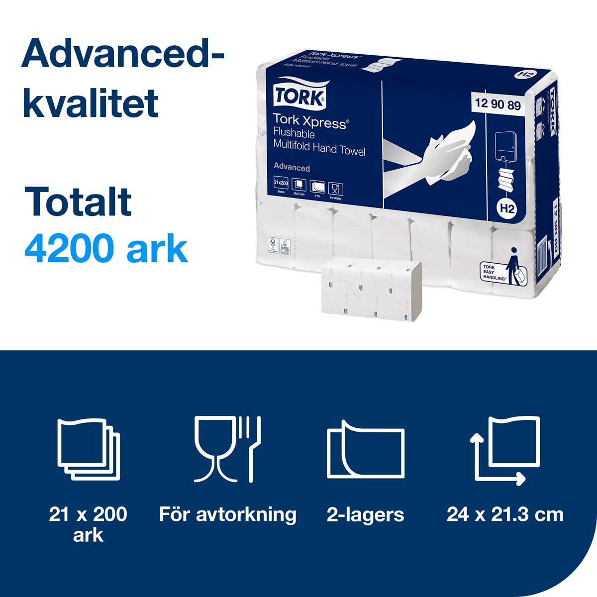 2-lags vitt och mjukt papper av hög kvalitet (Advanced). Snabbupplöslig i vatten - slipp stopp i avloppet. Idealisk för toalettutrymmen där handdukarna kanske kastas i toaletten istället för i papperskorgen. Arken är vikta så att nästa ark automatiskt dras fram. Lövmönstrad dekor i grått. Mått: 24 x 21,3 cm. 200 st/bunt, 4200 st/förp. Passar till Tork hållare H2.