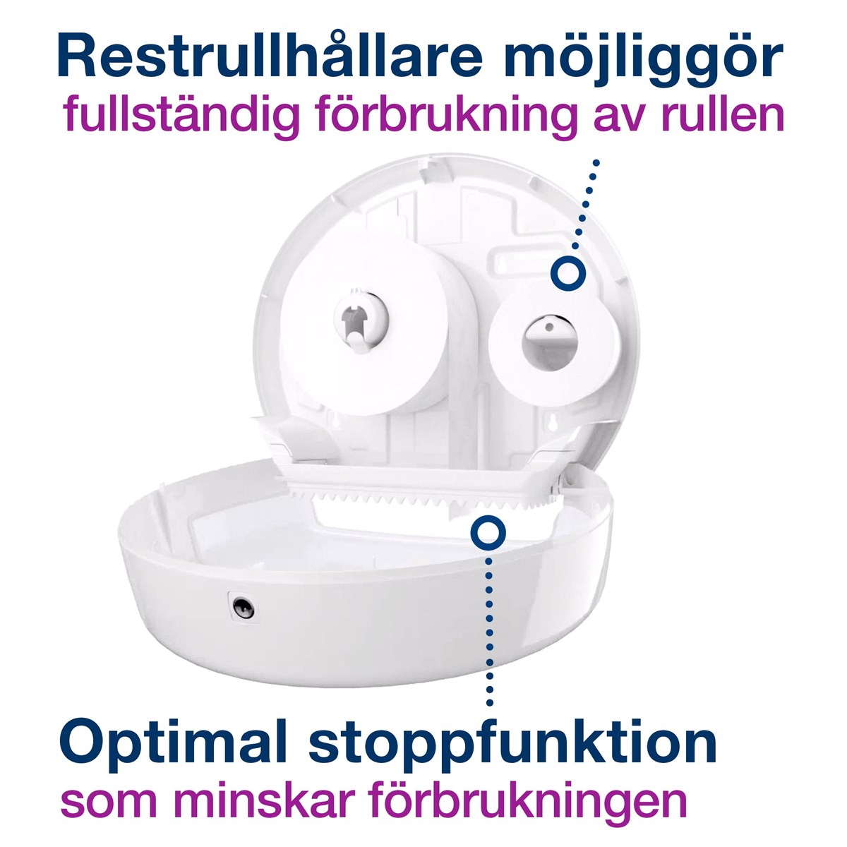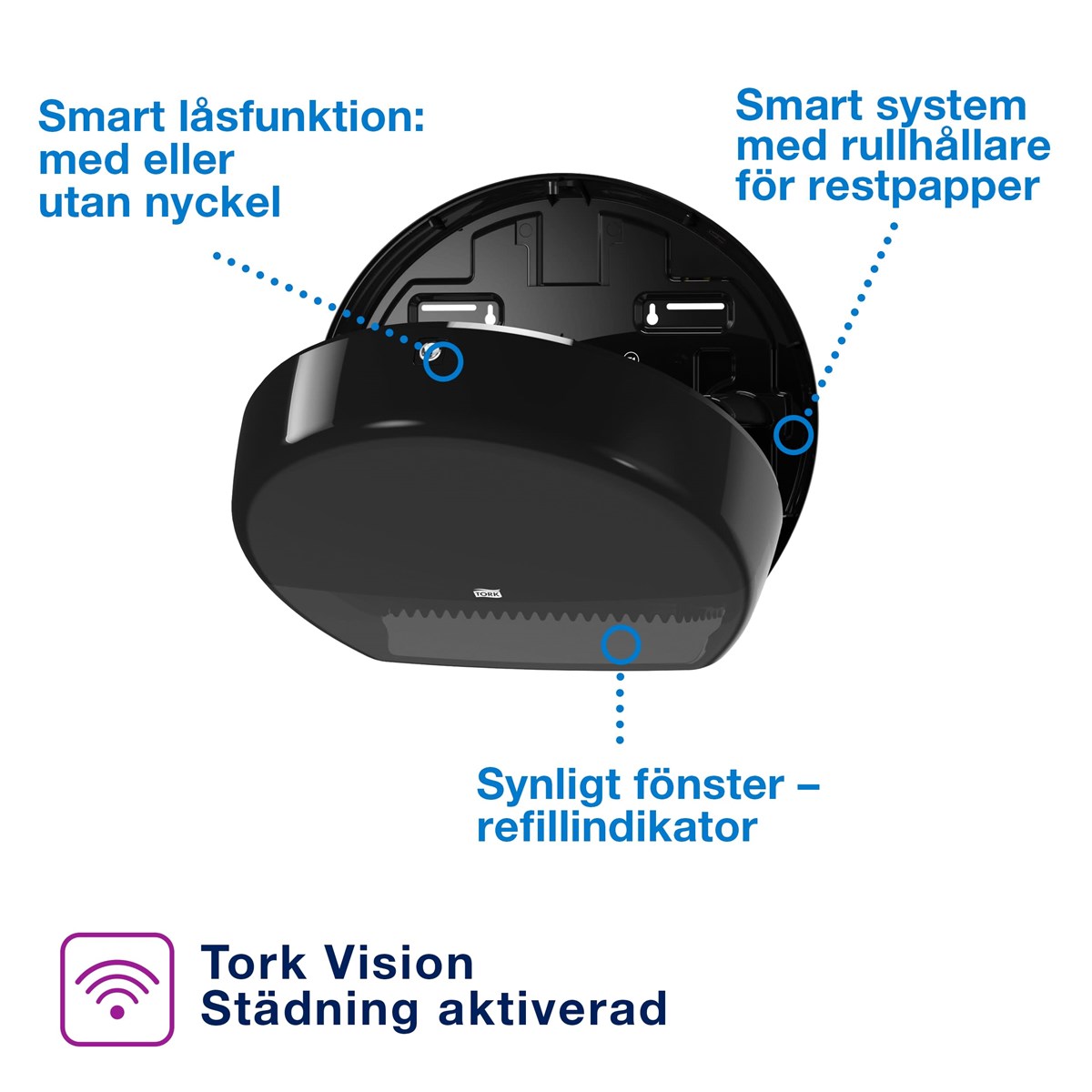 Tork Dispenser Mini Jumbo Toalettpapper i Elevation design passar perfekt för medel- till högtrafikerade toalettutrymmen, där det är viktigt att nyttja tiden effektivt och hålla kostnaderna låga. Den höga kapaciteten minskar tiden för underhåll och garanterar att det alltid finns papper. Tork Elevation dispensrar har en stilren, funktionell och modern design som skapar ett långvarigt intryck hos dina besökare.