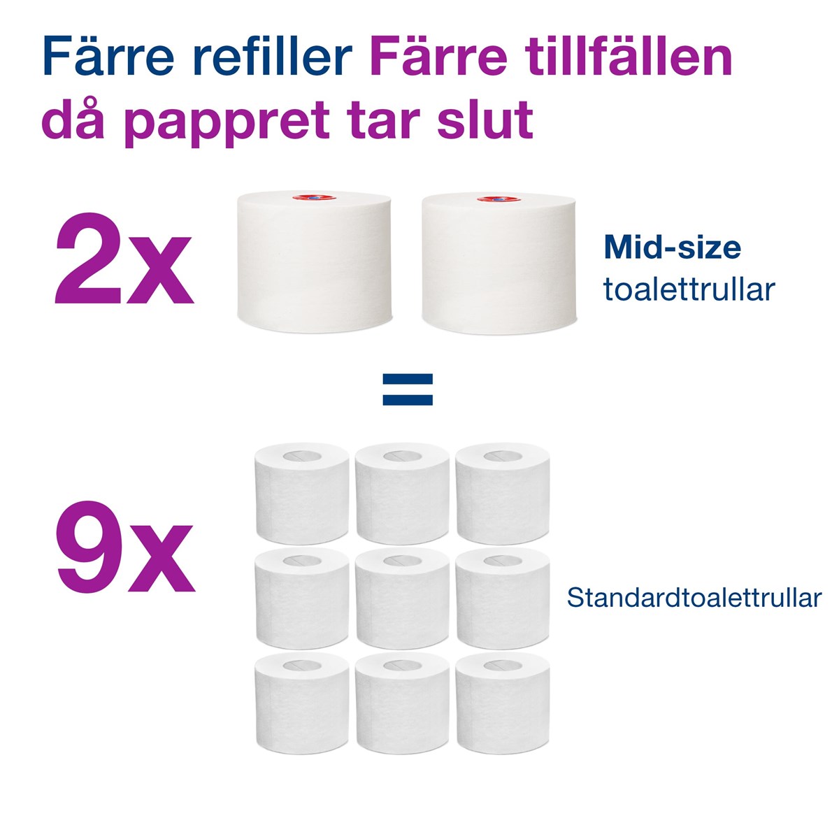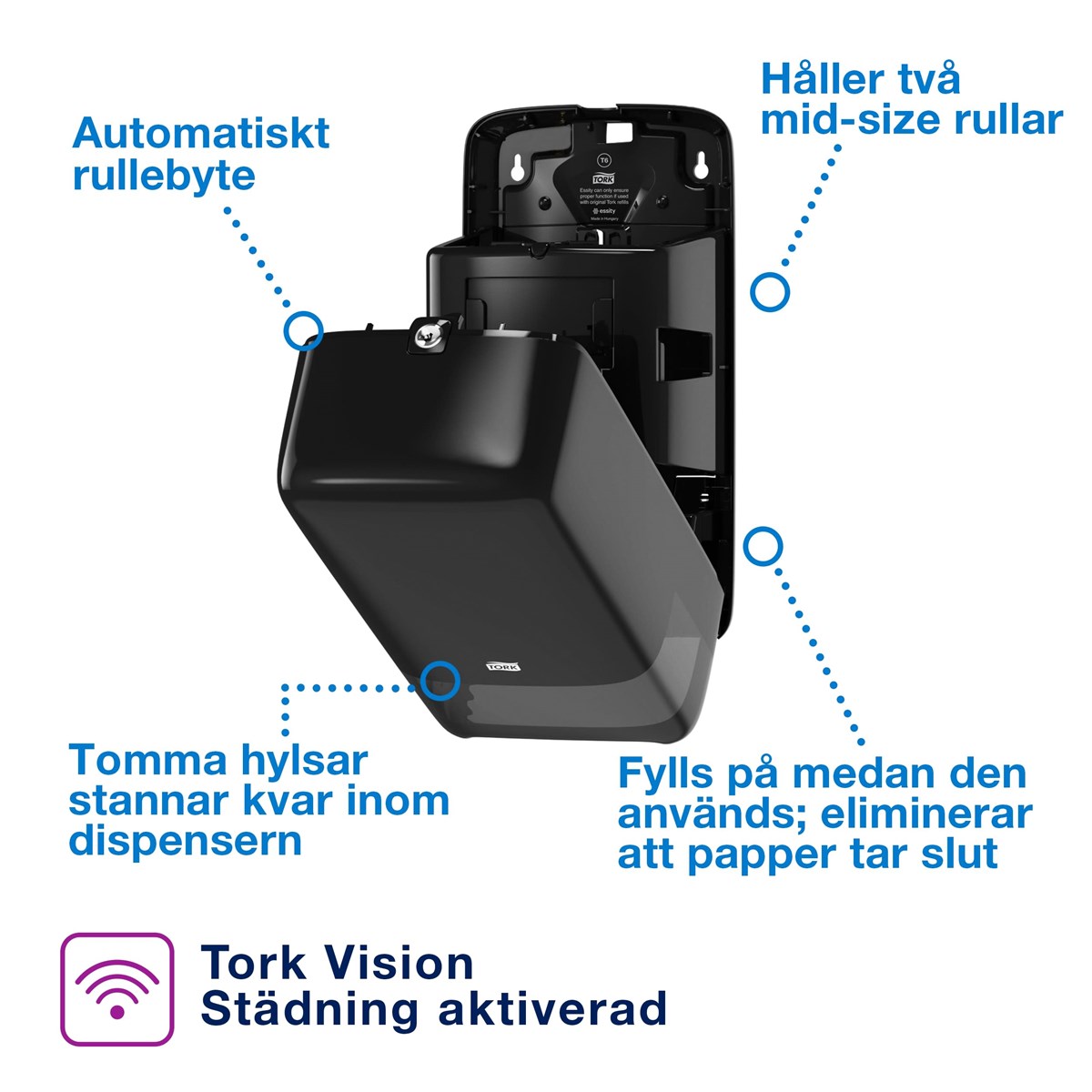 För toalettutrymmen med medelhög till hög besöksfrekvens Kompakt design för mindre utrymmen Hög kapacitet och enkel att fylla på Sluten dispenser för förbättrad hygien