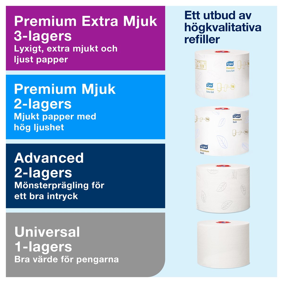 För toalettutrymmen med medelhög till hög besöksfrekvens Kompakt design för mindre utrymmen Hög kapacitet och enkel att fylla på Sluten dispenser för förbättrad hygien