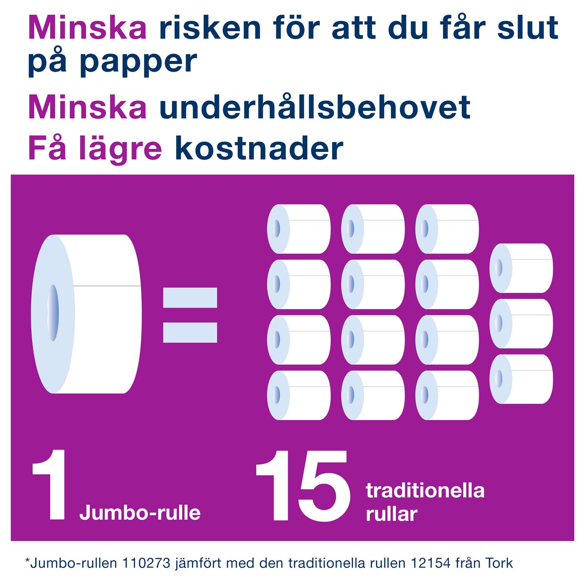 Systemet Tork Jumbo innebär effektivt utnyttjande av tiden och minskade kostnader och erbjuder mycket mer toalettpapper än standardrullar. Tork Jumbo toalettpapper med 2 lager skapar en god balans mellan kostnad och prestanda och passar perfekt för platser med hög besöksfrekvens.