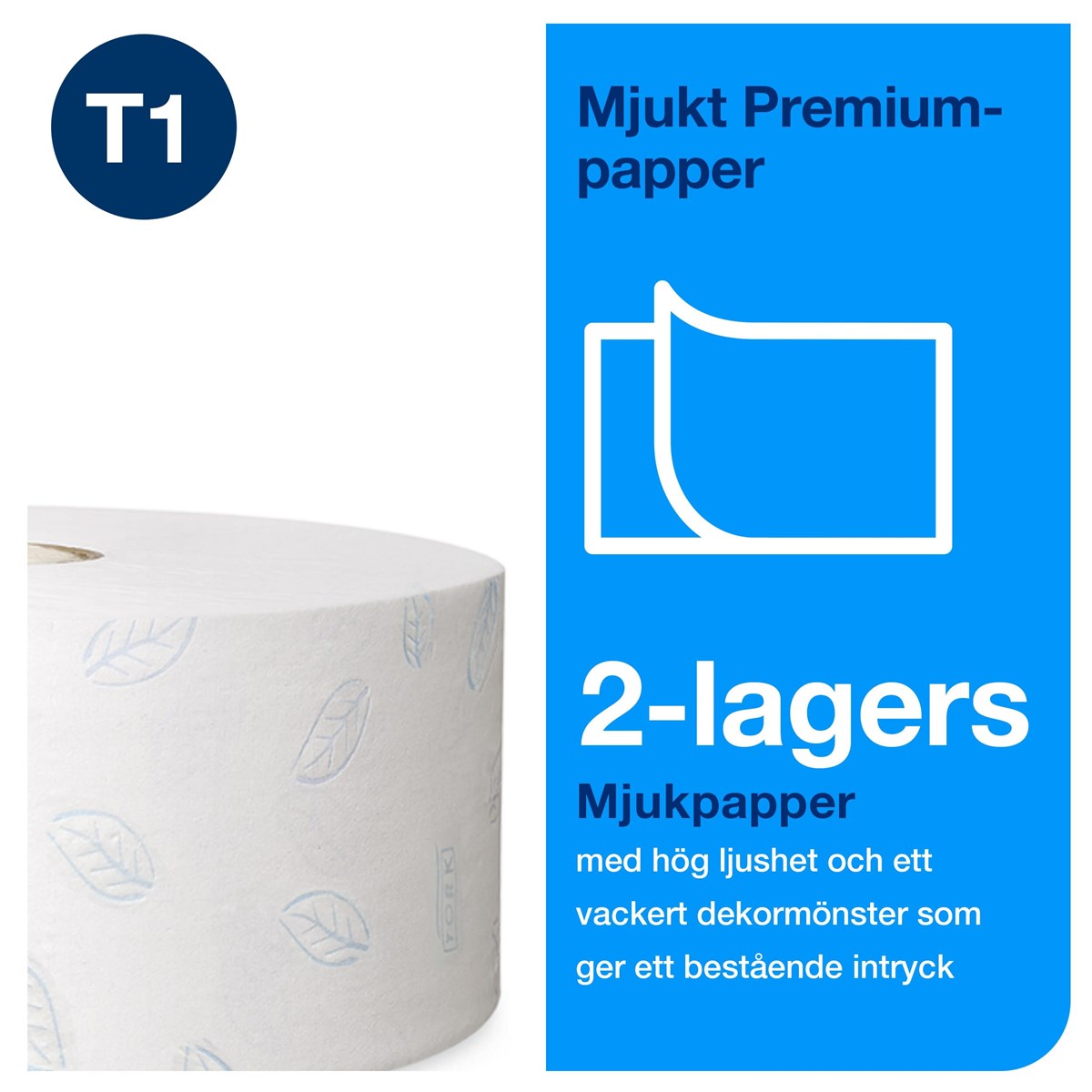 Mjukt toalettpapper av högsta kvalitet (Premium). Vitt, perforerat. 2-lags. Blå dekorprägling. 360 m. 6 rullar/förp. Passar till Tork hållare T1.