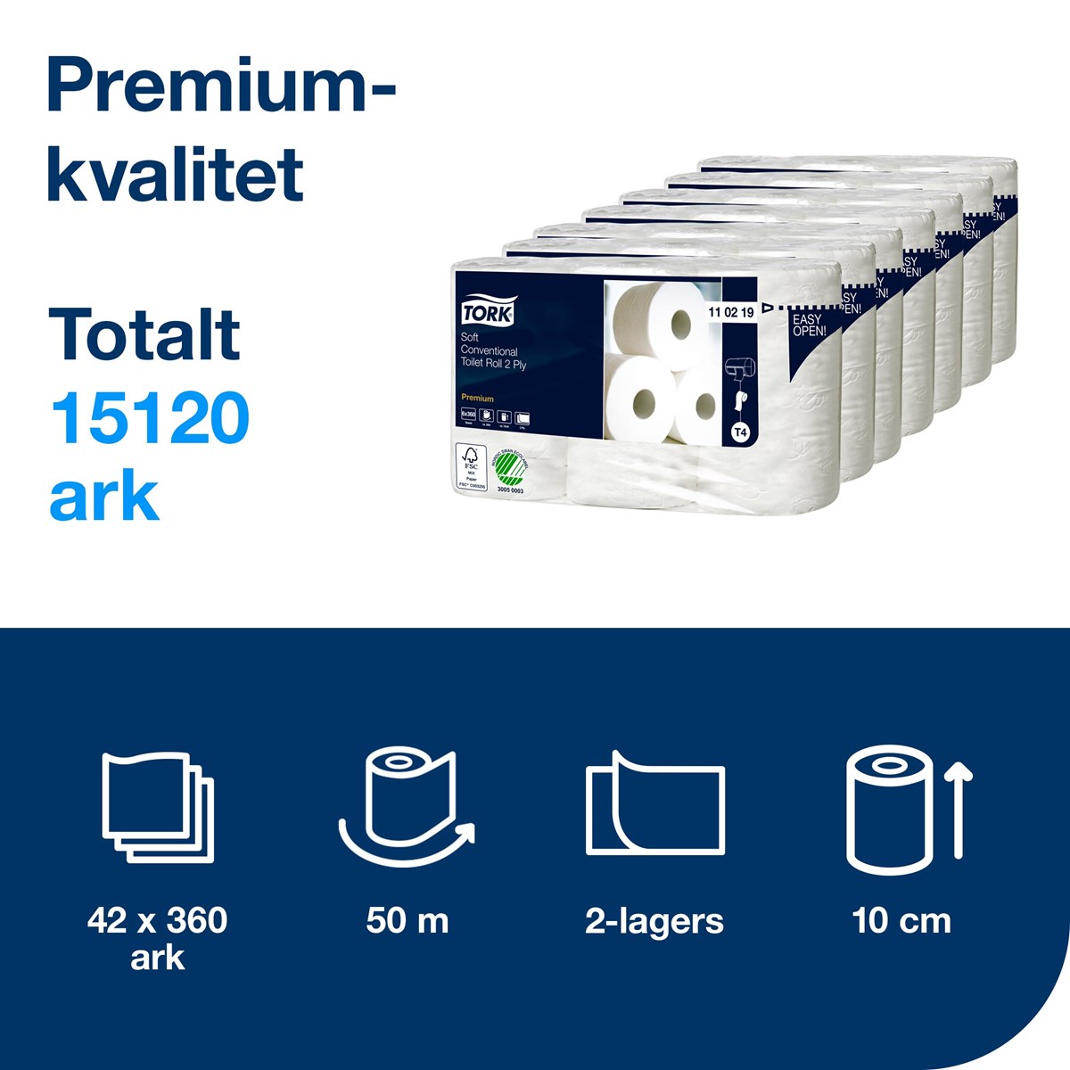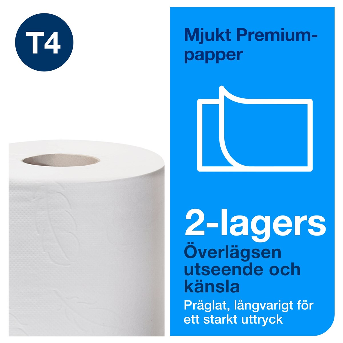Mjukt och ljust papper för ett bestående intryck För toalettutrymmen med låg besöksfrekvens Mönsterpräglad premiumdesign Tork Easy Handling-förpackning är enkel att bära och göra sig av med