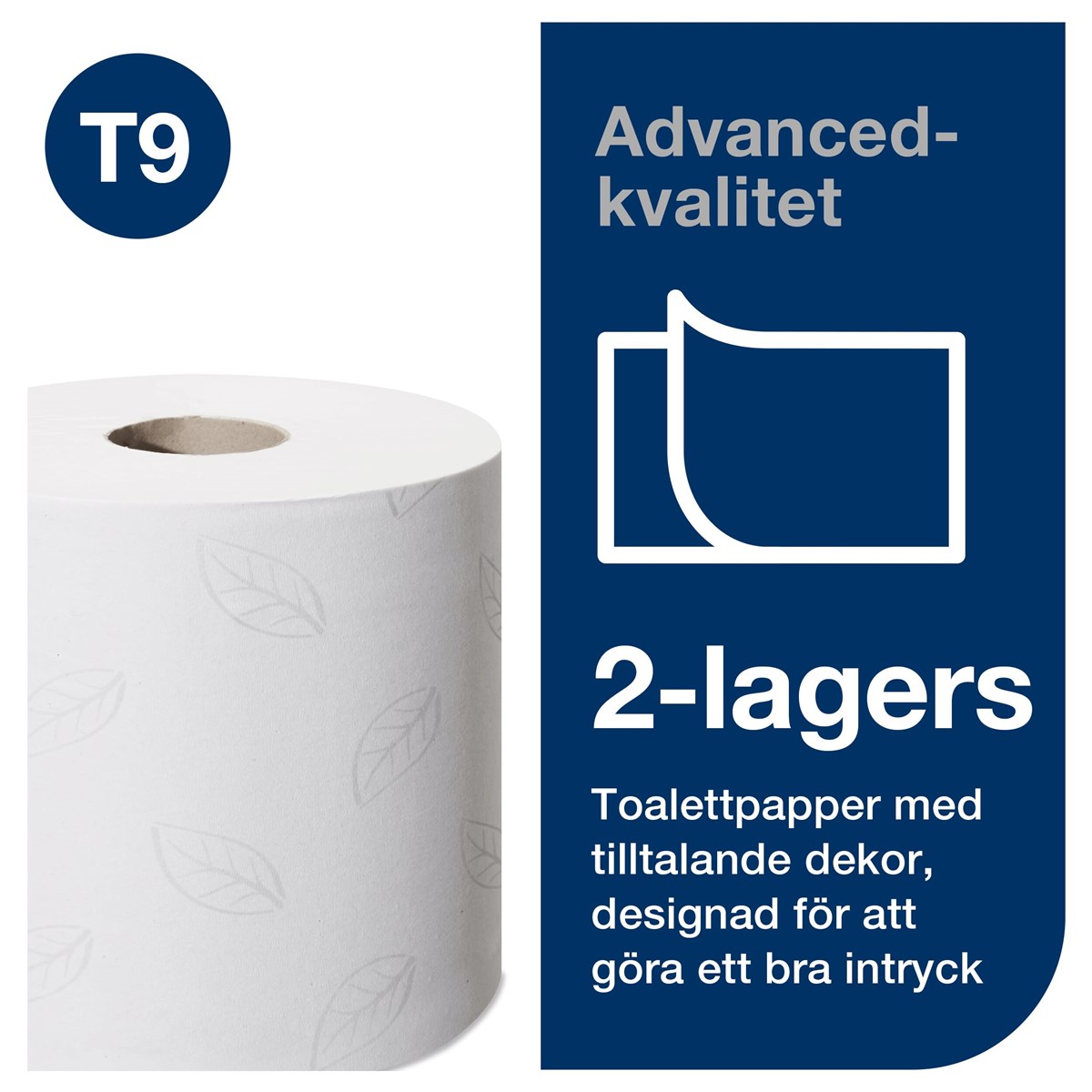 2-lags vitt toalettpapper av hög kvalitet. Ett unikt toalettpapper i och med att det matar ut ett hygieniskt ark i taget, vilket hjälper till att minska förbrukningen med upp till 40% jämfört med traditionella jumbodispensrar. Snabb upplösning av pappret – låg risk för stopp i avloppet. Grå dekor. 112 m/ rulle. 12 rl/förp.